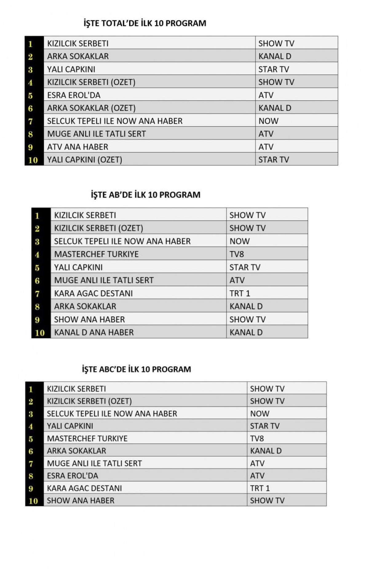 Her gün bir önceki güne ait Total, AB ve ABC sıralaması belli olurken dünün reyting sonuçları merakla bekleniyor.