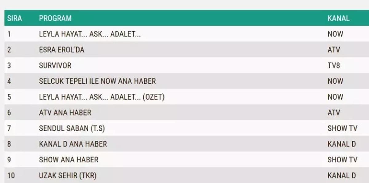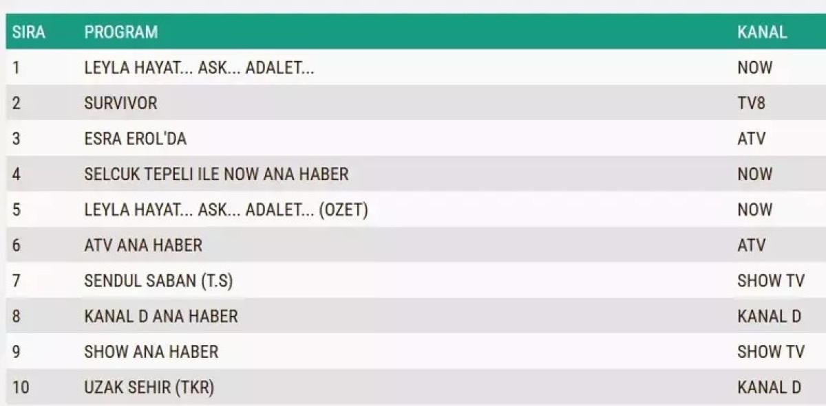 Her gün bir önceki güne ait Total, AB ve ABC sıralaması belli olurken dünün reyting sonuçları merakla bekleniyor.