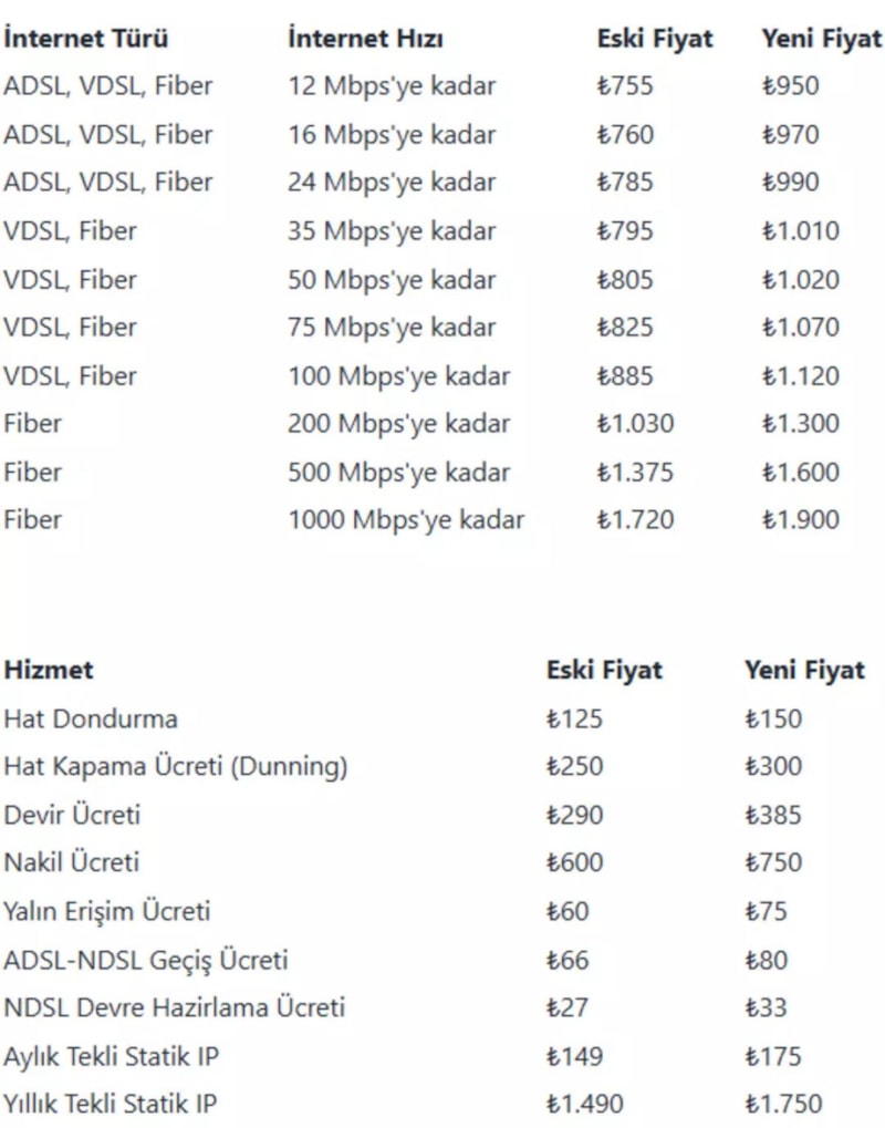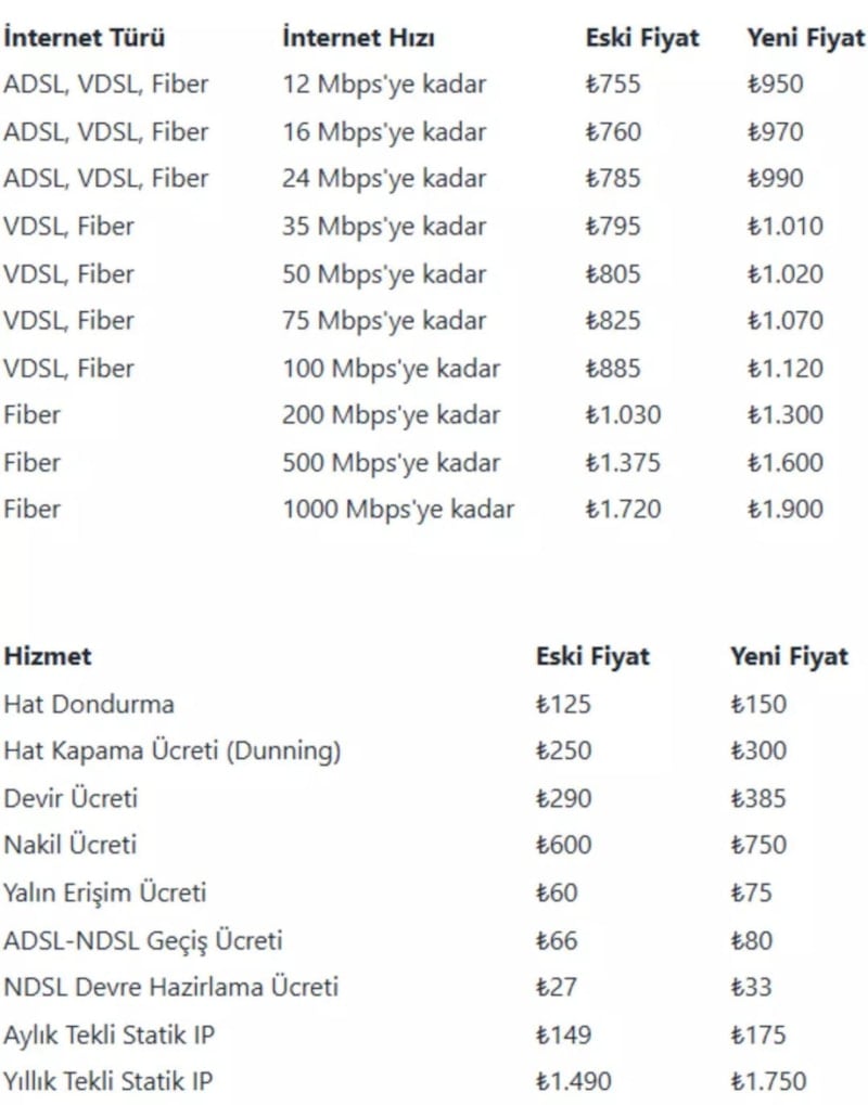 ADSL, VDSL ve Fiber internet kullanıcılarını kapsayan yeni tarifelerde, limitsiz paketlerde ortalama %20'lik bir zam uygulanacak.