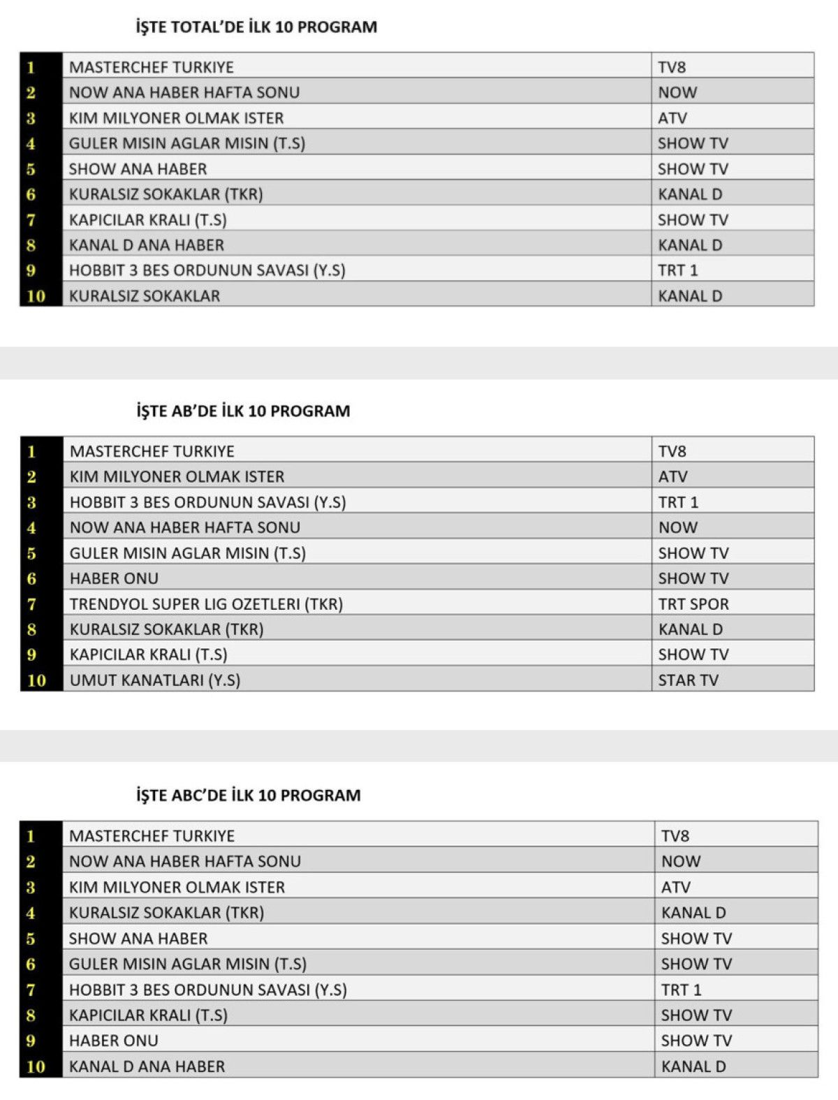 AB kategorisinde 1. sırada “Masterchef Türkiye”, 2. sırada “Kim Milyoner Olmak İster”, 3. sırada ise “Hobbit 3: Beş Ordunun Savaşı” dizisi yer aldı.