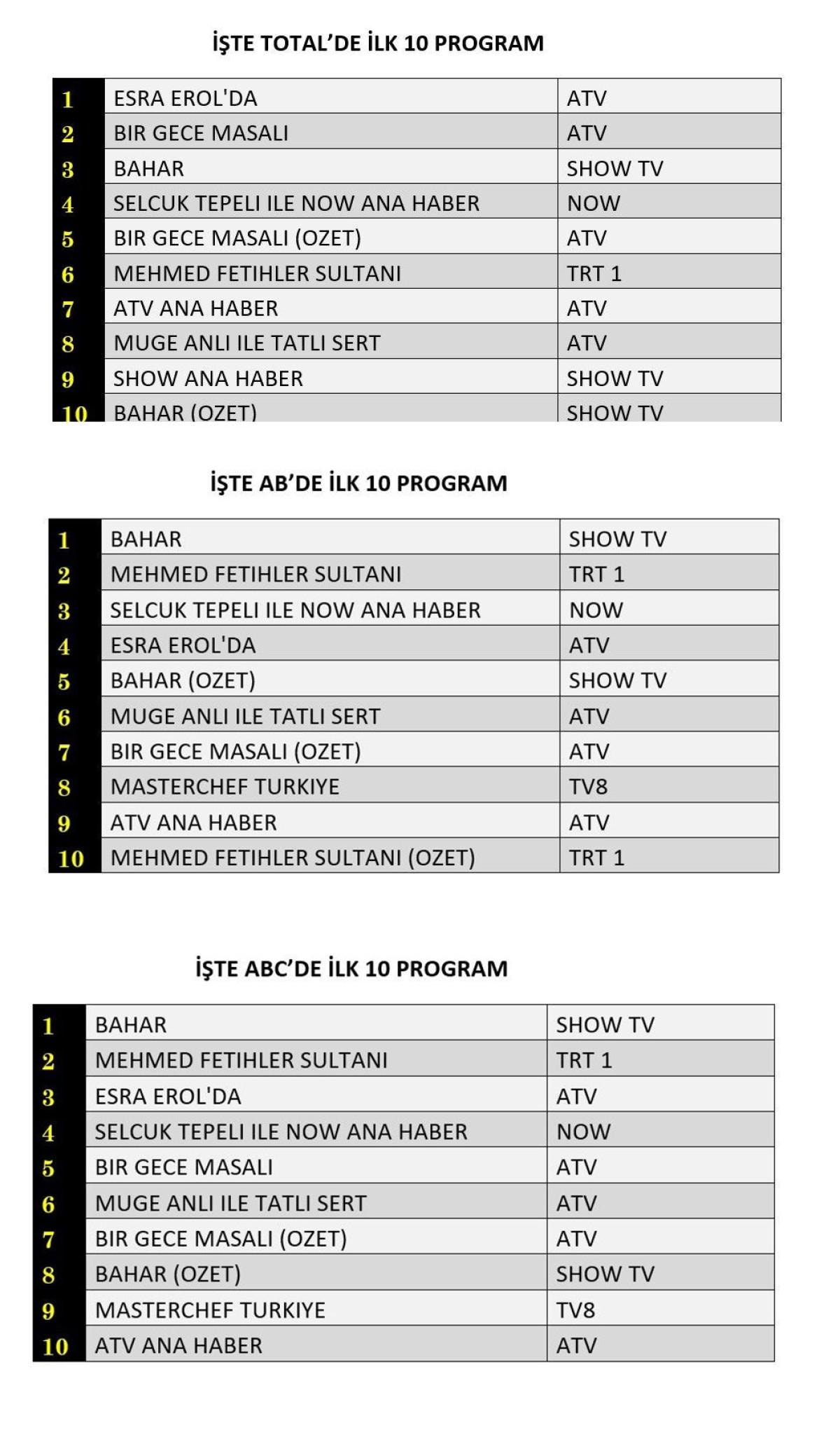 ABC Kategorisinde 1. sırada Show TV’nin sevilen dizisi Bahar yer aldı. 2. sırada TRT1’de yayınlanan Mehmet Fetihler Sultanı, 3. sırada 1. sırada Esra Erol’da programı yer aldı.