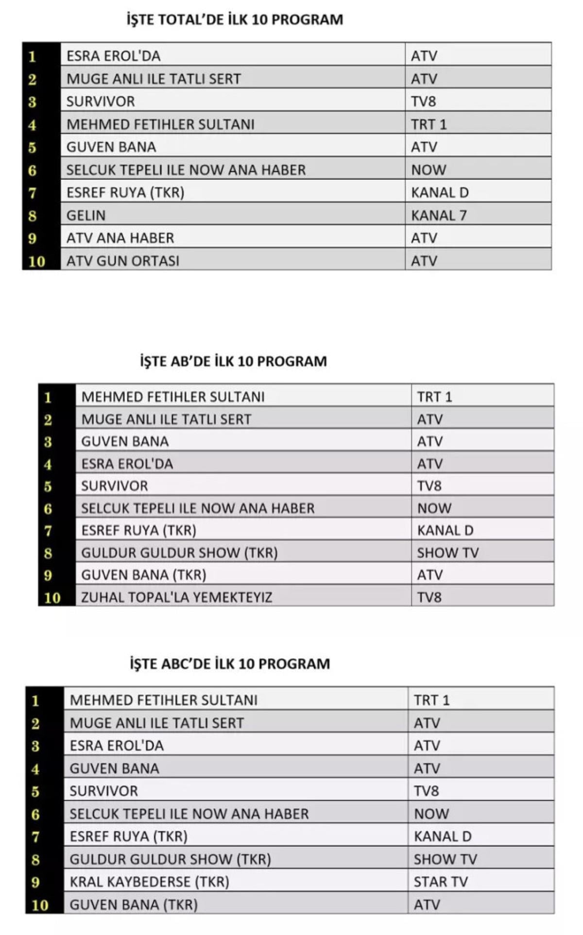 Her gün bir önceki güne ait Total, AB ve ABC sıralaması belli olurken dünün reyting sonuçları merakla bekleniyor.