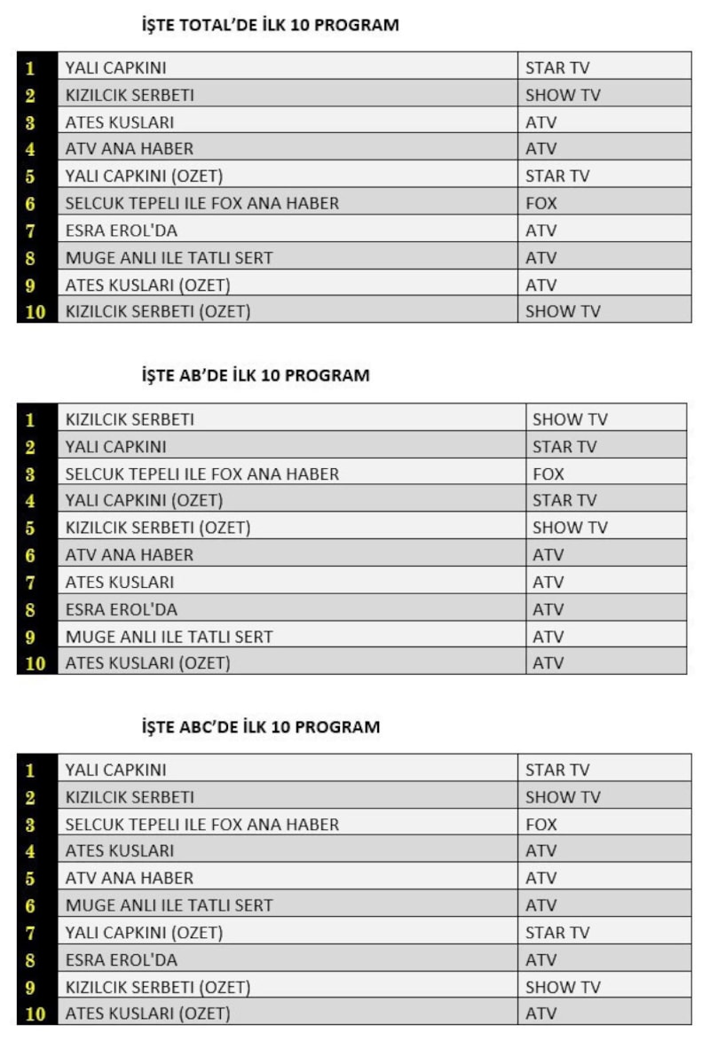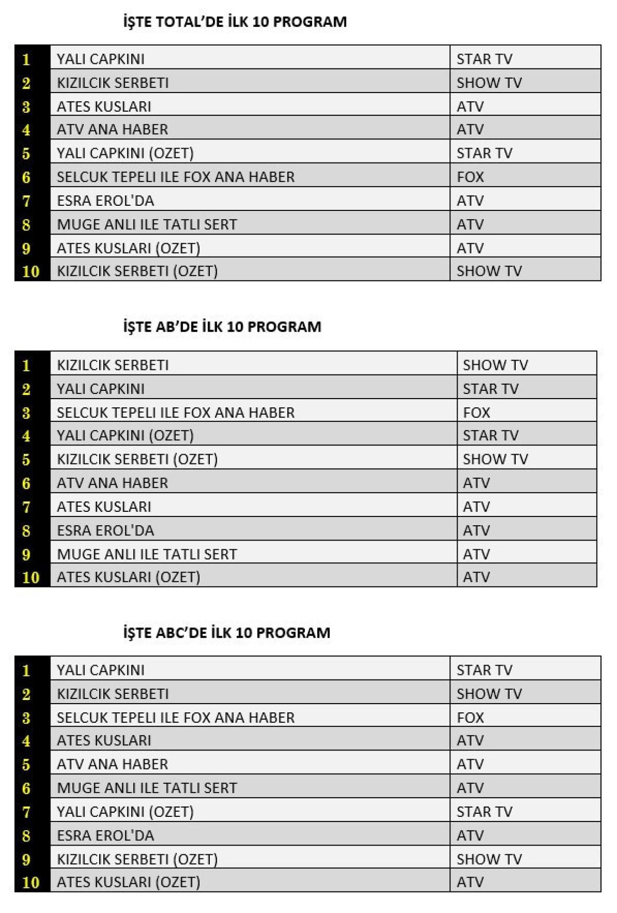 Her gün bir önceki güne ait Total, AB ve ABC sıralaması belli olurken dünün reyting sonuçları merakla bekleniyor.