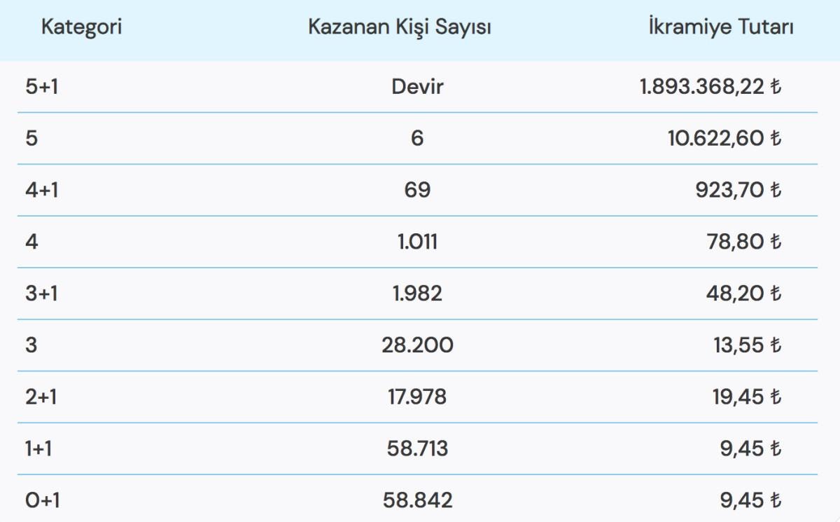 Yapılan çekiliş sonuçlarına göre 5+1 bilen çıkmadığı için büyük ikramiye olan 1.893.368,22 TL devretti.