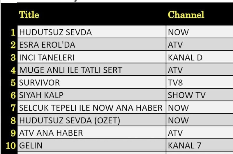 Total grubunda NOW TV'nin sevilen dizisi Hudutsuz Sevda zirveye yerleşti. AB ve ABC gruplarında ise zirveyi İnci Taneleri dizisi kaptı.