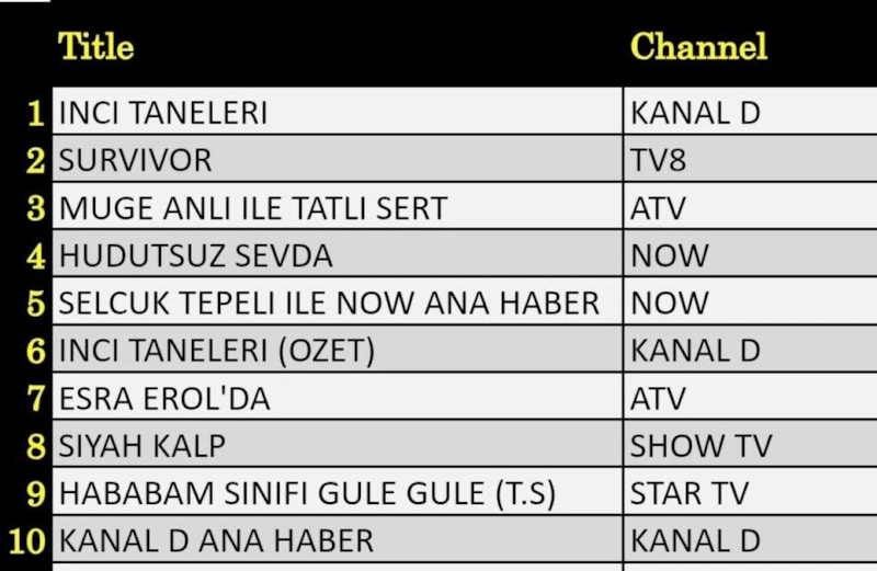 Her gün bir önceki güne ait Total, AB ve ABC sıralaması belli olurken dünün reyting sonuçları merakla bekleniyor.