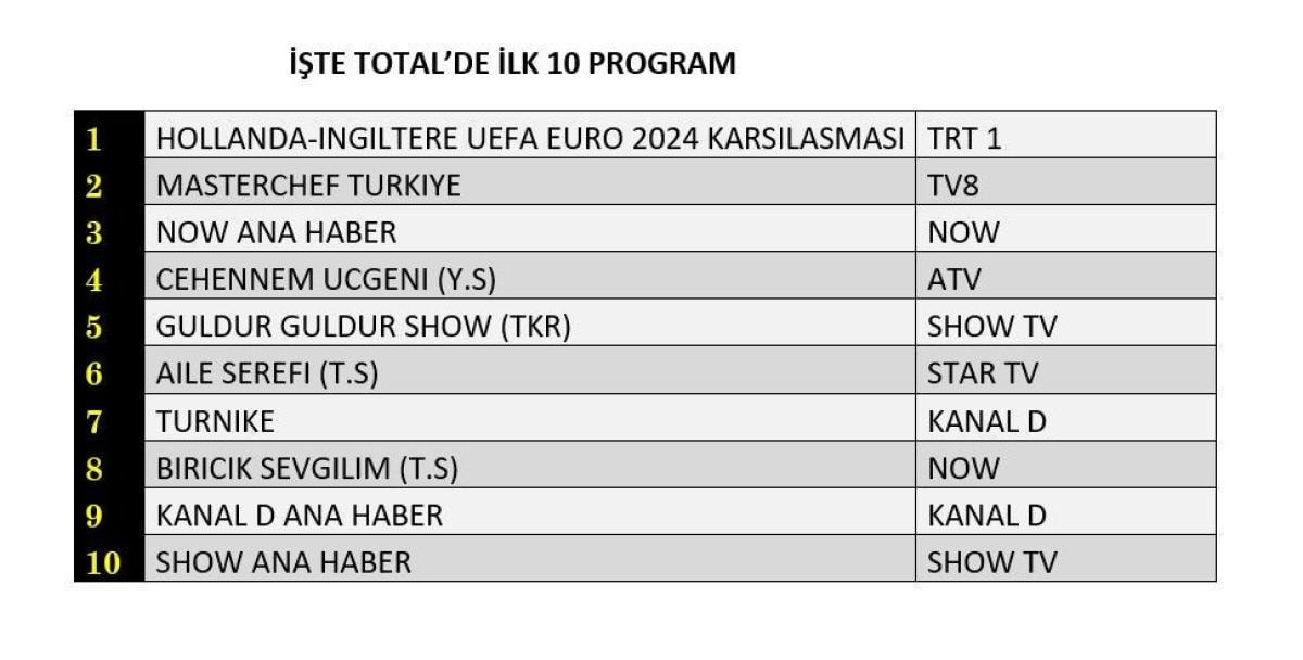 Total'de reyting listesinin ilk sırasında Hollanda İngiltere UEFA EURO 2024 Karşılaşması, ikinci sırada Masterchef Türkiye, üçüncü sırada Now Ana Haber yer aldı.