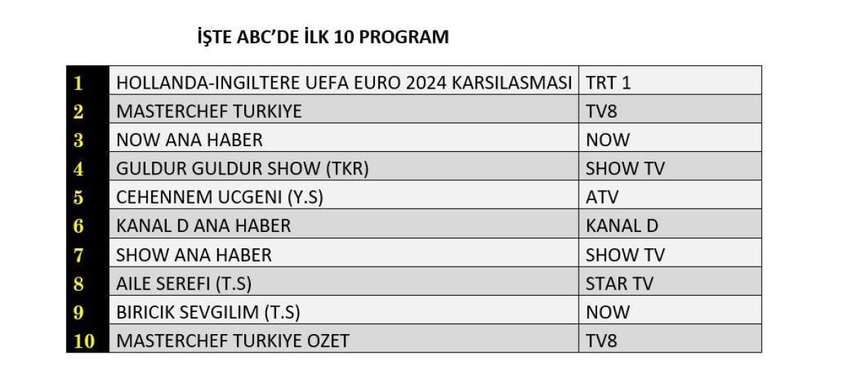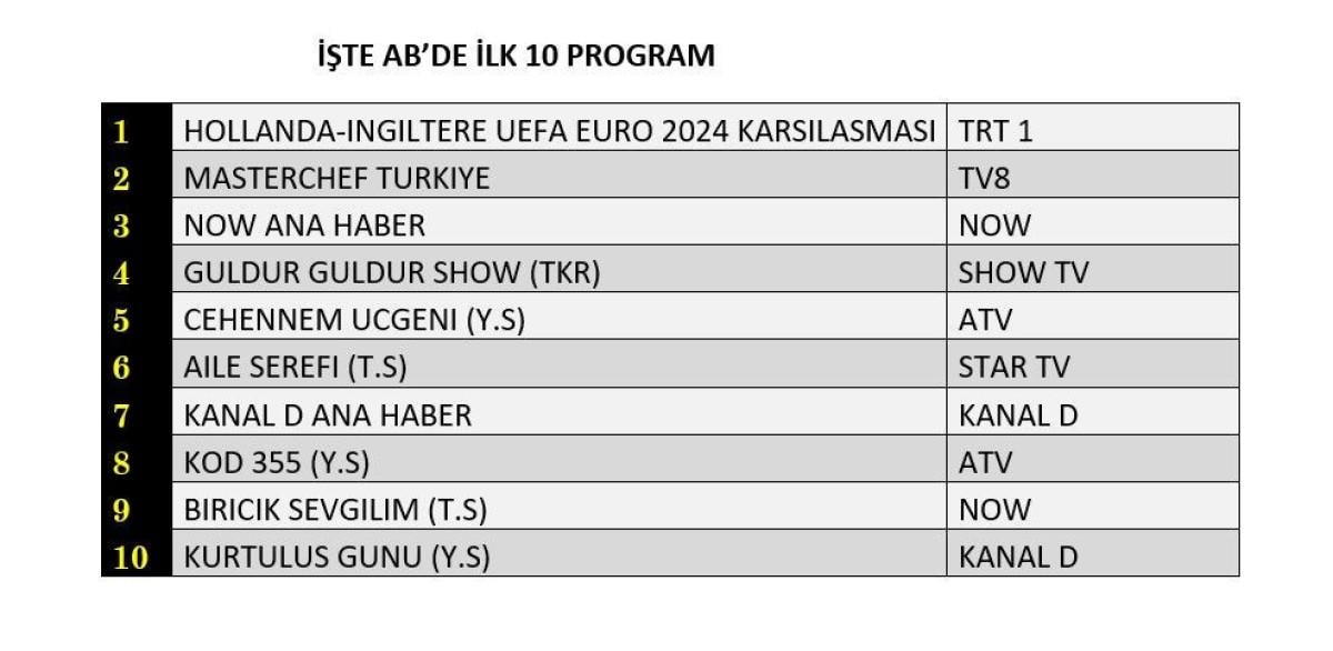 AB'de birinci sırada Hollanda İngiltere UEFA EURO 2024 Karşılaşması, ikinci sırada Masterchef Türkiye, üçüncü sırada Now Ana Haber yer aldı.