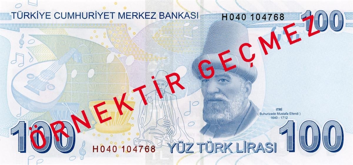 - 100 Türk Lirası'nın arka yüzünde, Osmanlı dönemi klasik müziğinin önemli bestekârlarından Buhurizade Mustafa Itri Efendi yer almaktadır.