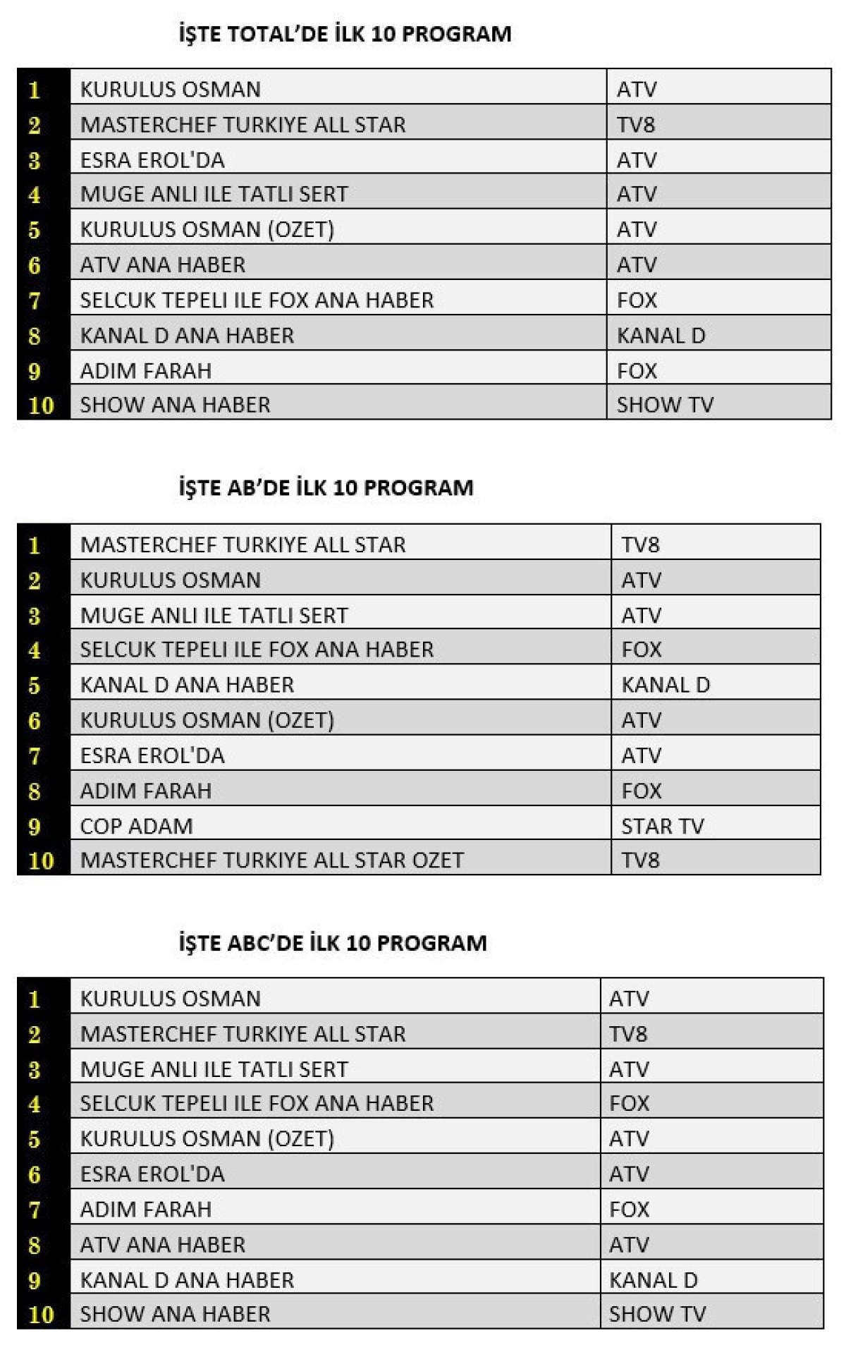 AB'de ise birinci sırada Masterchef Türkiye All Star, ikinci sırada Kuruluş Osman, üçüncü sırada Müge Anlı ile Tatlı Sert yer aldı.