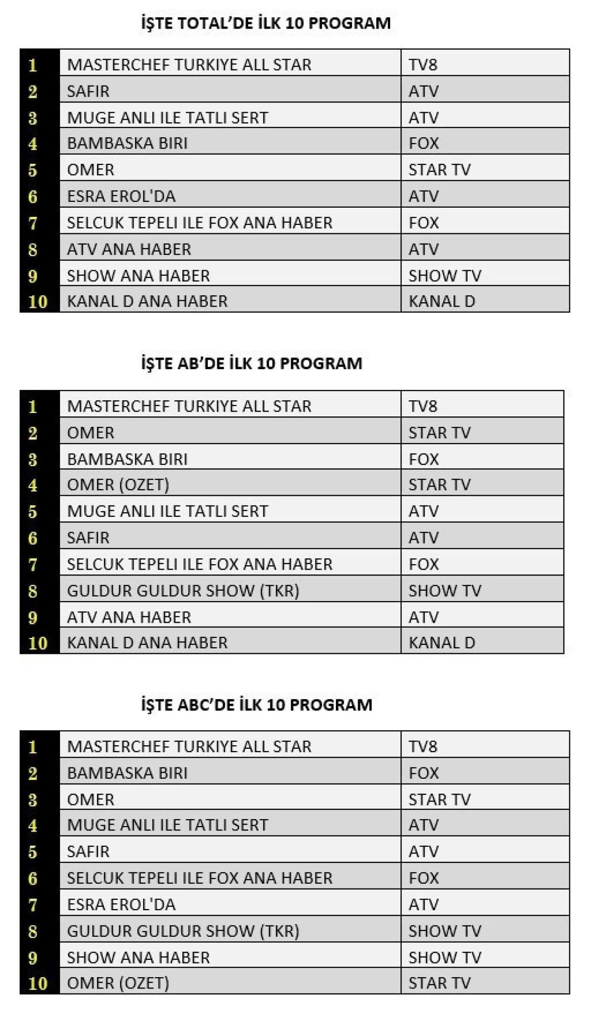 20+ABC1 izleyici grubunda ise birinci sırada “Masterchef Türkiye All Star”, ikinci sırada “Bambaşka Biri”, üçüncü sırada “Ömer” yer aldı.