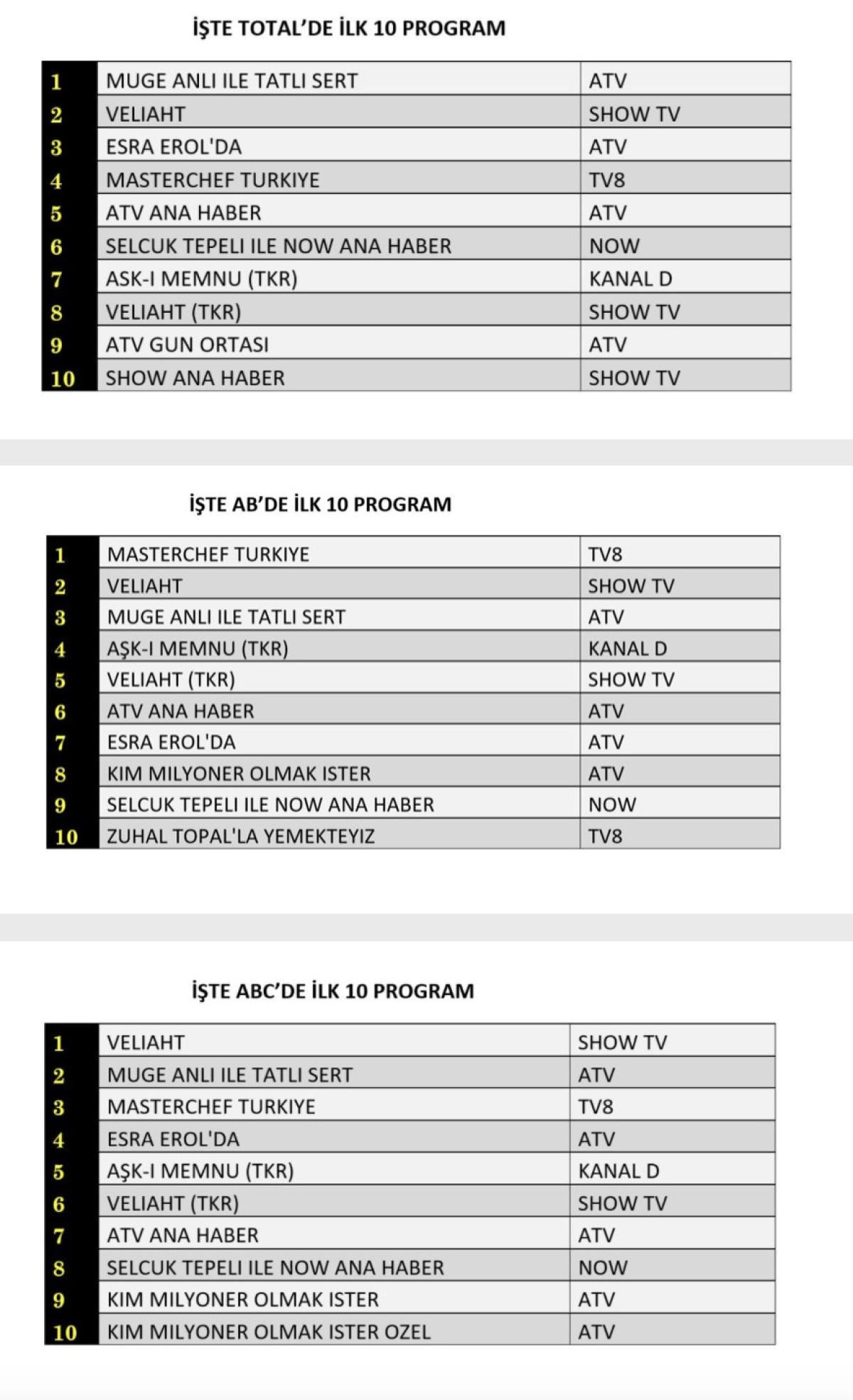 ABC kategorisinde ise birinci sırayı “Veliaht” elde etti. İkinci sırada “Müge Anlı İle Tatlı Sert”, üçüncü sırada ise “Masterchef Türkiye” yer aldı..