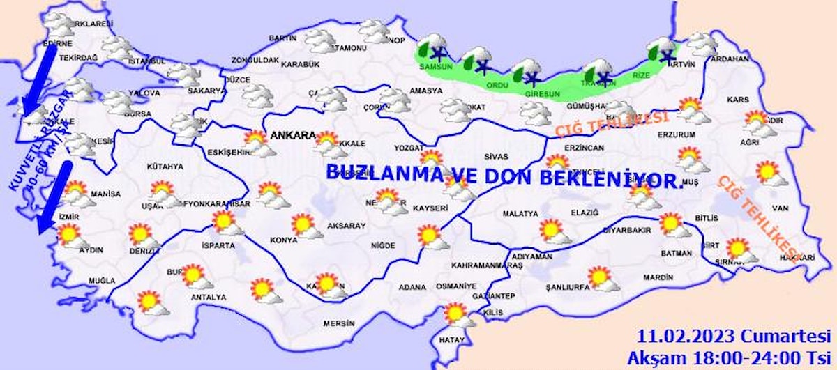 Meteoroloji Genel Müdürlüğü tarafından yapılan son değerlendirmelere göre: Ülkemizin kuzey, iç ve doğu kesimlerinin parçalı ve çok bulutlu, Karadeniz kıyıları ile Çanakkale'nin iç, Balıkesir'in kuzey kesimleri, İstanbul'un Anadolu Yakası, Yalova, Sakarya, Kocaeli ve Karabük, çevrelerinin yerel olmak üzere karla karışık yağmur ve kar yağışlı, diğer yerlerin az bulutlu geçeceği tahmin ediliyor. Buzlanma ve don ile birlikte iç ve doğu kesimlerde pus ve yer yer sis bekleniyor. Doğu Karadeniz’in iç kesimlerinin yüksekleri ile Doğu Anadolu’nun eğimli ve yüksek kesimlerinde çığ tehlikesi riski bulunmaktadır.