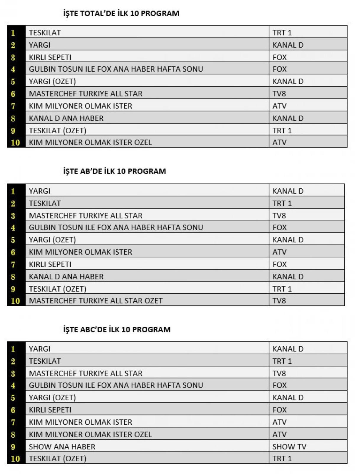 AB'de ise birinci sırada Yargı, ikinci sırada Teşkilat, üçüncü sırada Masterchef Türkiye All Star yer aldı.
