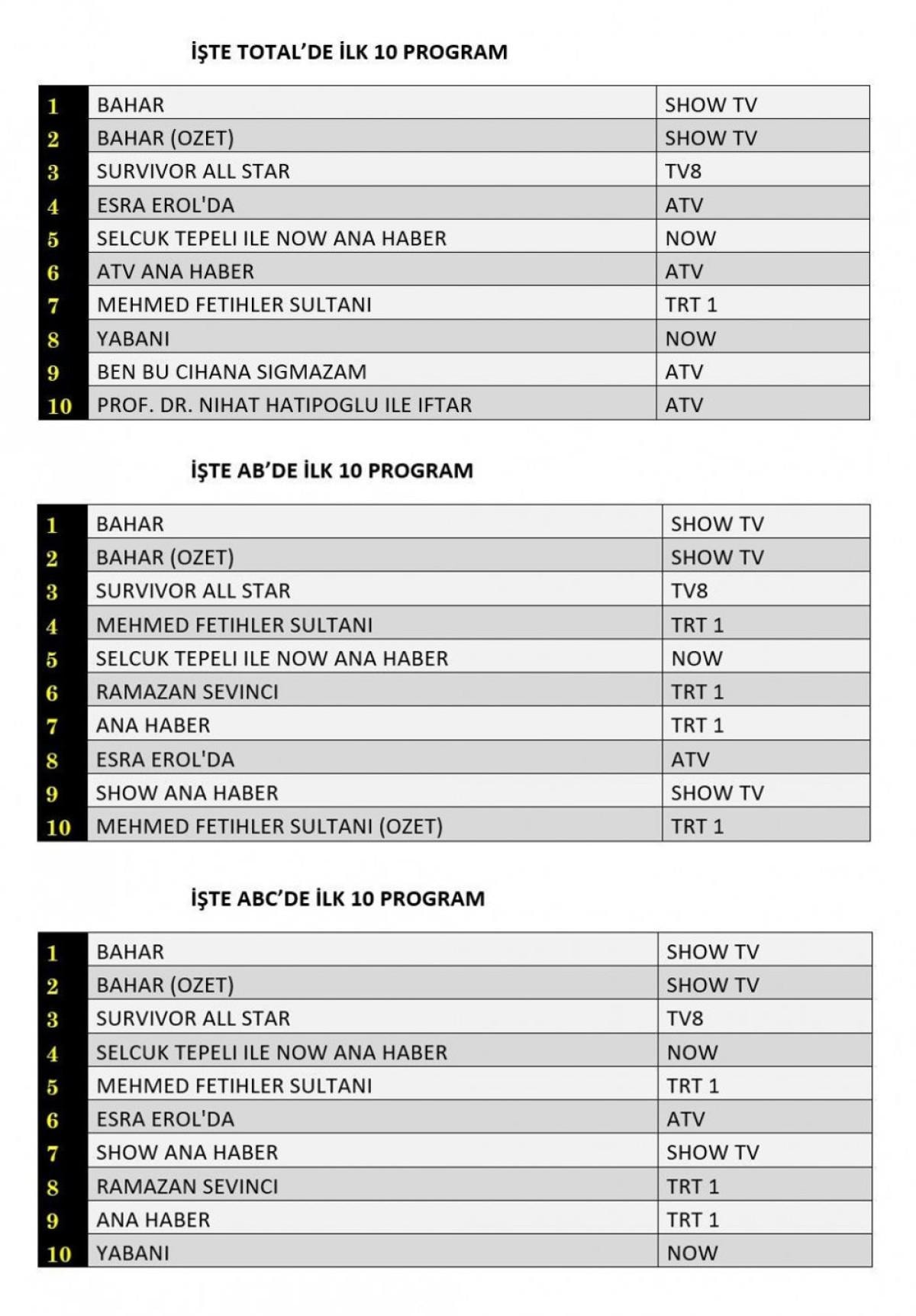 Her gün bir önceki güne ait Total, AB ve ABC sıralaması belli olurken dünün reyting sonuçları merakla bekleniyor.