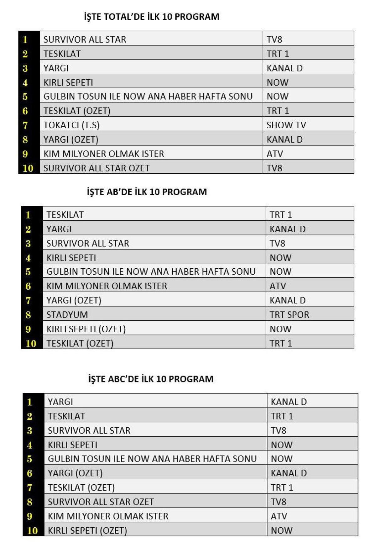 Total'de reyting listesinin ilk sırasında Survivor All Star, ikinci sırada Teşkilat, üçüncü sırada Yargı yer aldı.