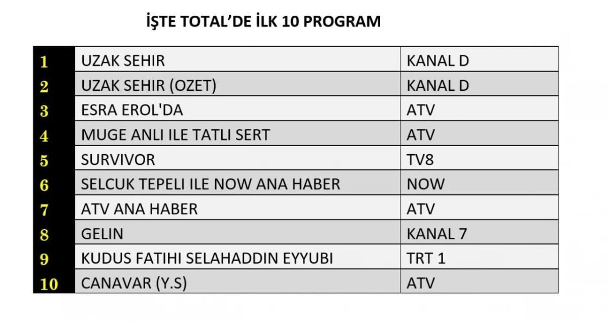 Total grubunda “Uzak Şehir” açık ara zirvede yer aldı. Dizinin özeti ikinci sırada yer alırken, gündüz kuşağının güçlü ismi “Esra Erol’da” üçüncülüğü aldı.