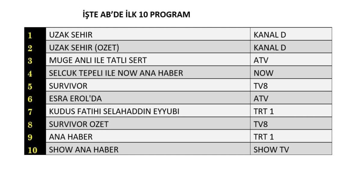 AB grubunda da “Uzak Şehir” liderliği bırakmadı. Özet bölümü yine ikinci sırada yer aldı. Üçüncü sırada ise “Müge Anlı ile Tatlı Sert” yer aldı.