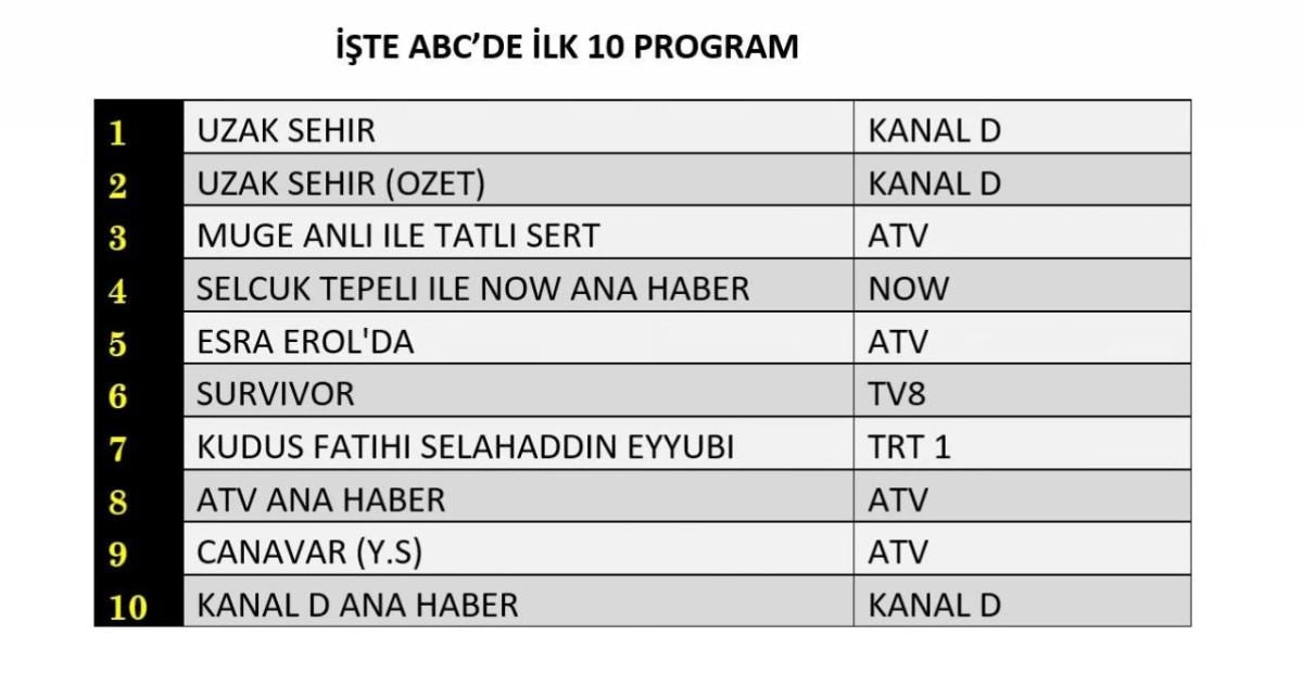ABC grubunda da “Uzak Şehir” yine zirvede, dizinin özeti ikinci sırada, “Müge Anlı” ise üçüncü sırada yer aldı.
