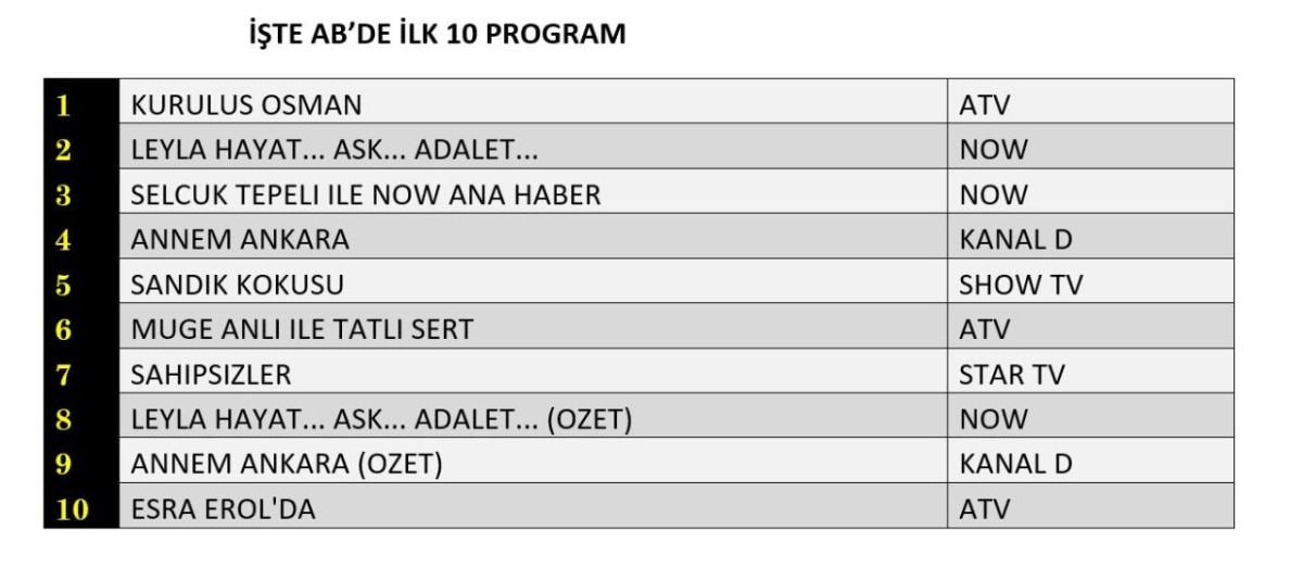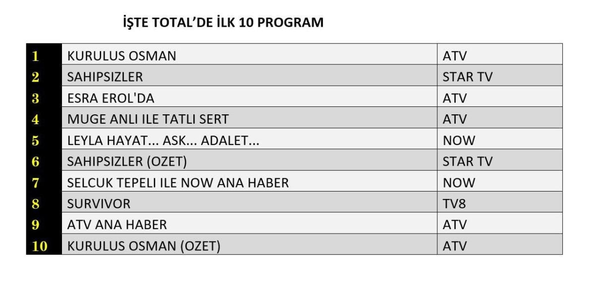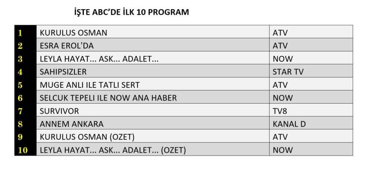 Her gün bir önceki güne ait Total, AB ve ABC sıralaması belli olurken dünün reyting sonuçları merakla bekleniyor.