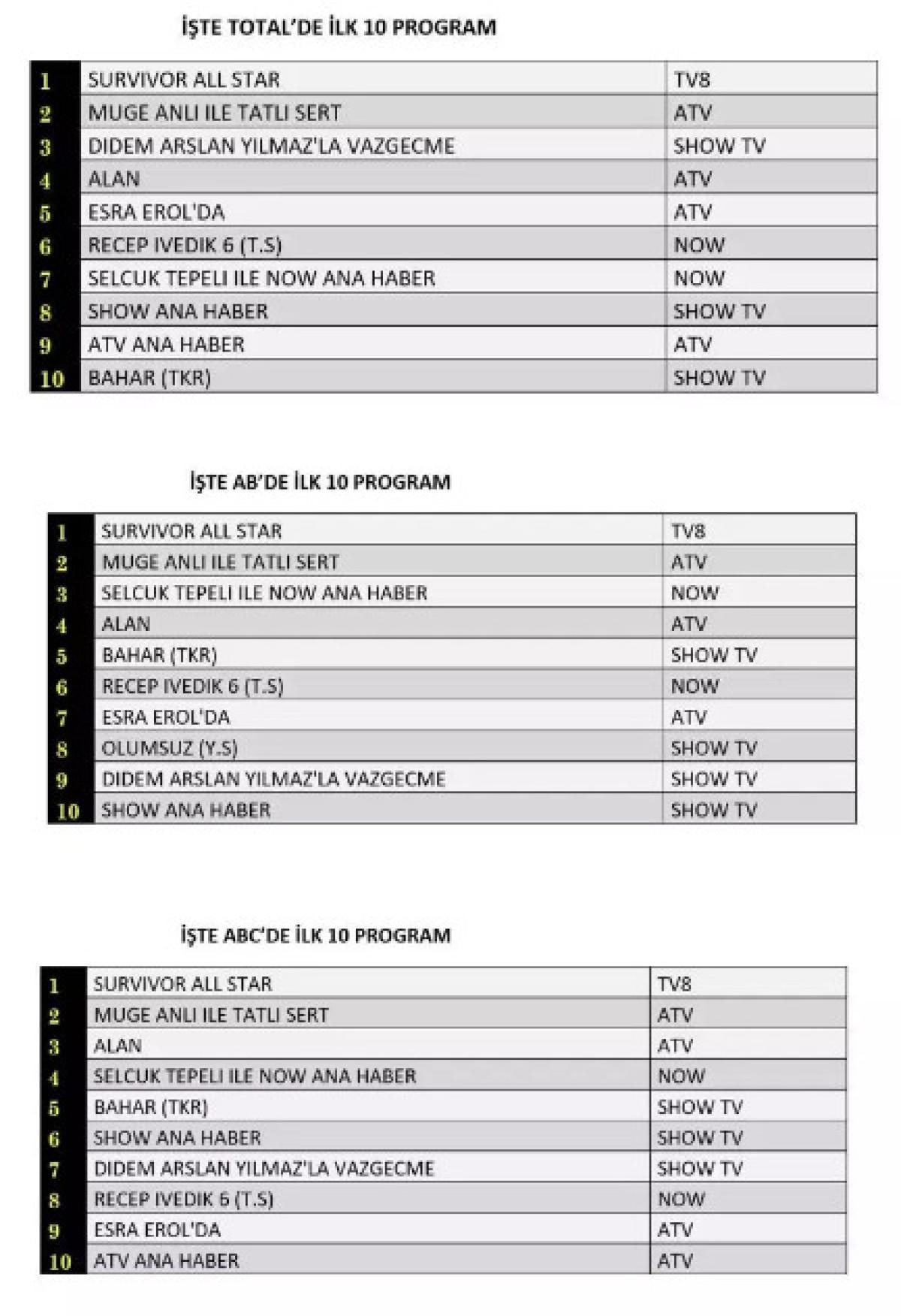 Her gün bir önceki güne ait Total, AB ve ABC sıralaması belli olurken dünün reyting sonuçları merakla bekleniyor.