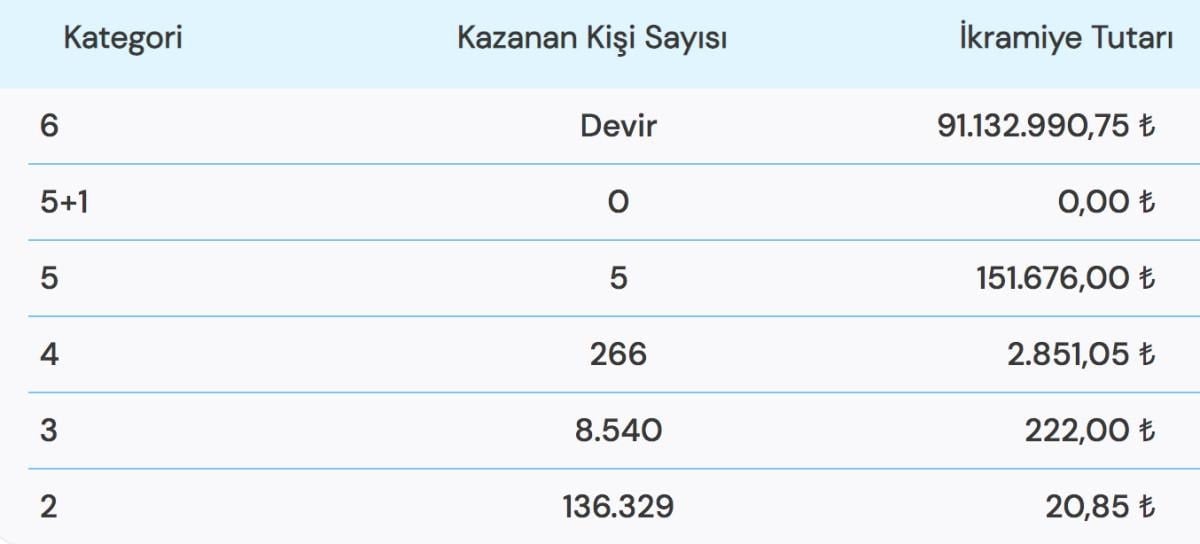 Büyük ikramiyenin 91.132.990,75 TL olduğu çekilişte 6 bilen çıkmadığı için büyük ikramiye devretti.