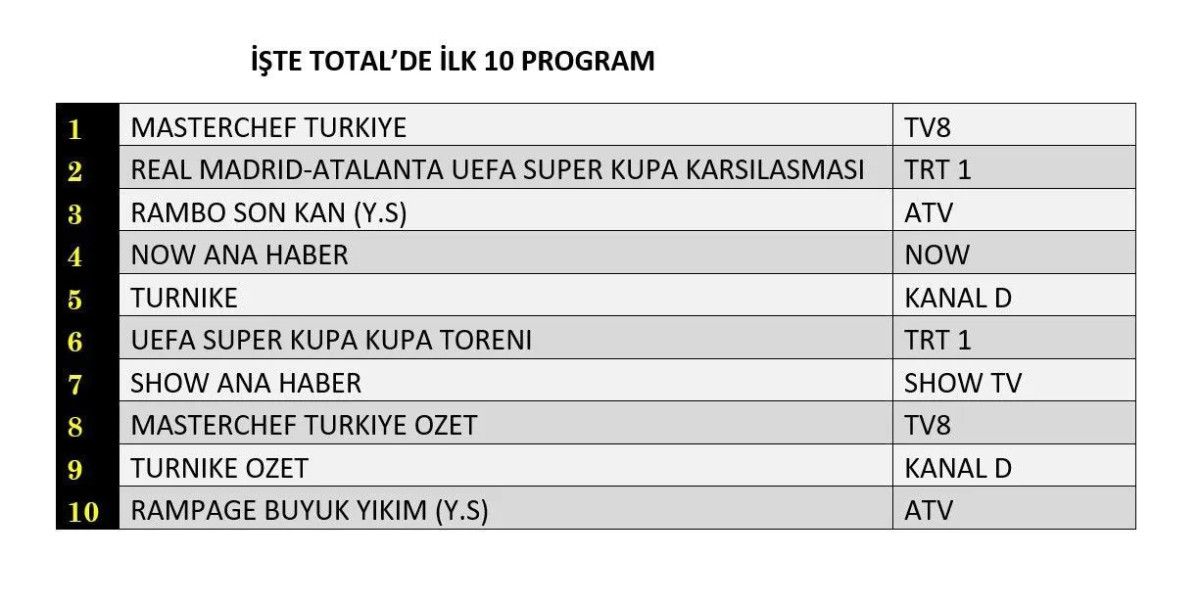 Total'de 1. sırada TV8’de izleyiciyle buluşan “Masterchef Türkiye”, 2. Sırada TRT1’de yayınlanan “Real Madrid-Atalanta UEFA Süper Kupa Karşılaşması”, 3. sırada Atv’de ekrana gelen yabancı sinema “Rambo Son Kan” yer aldı.