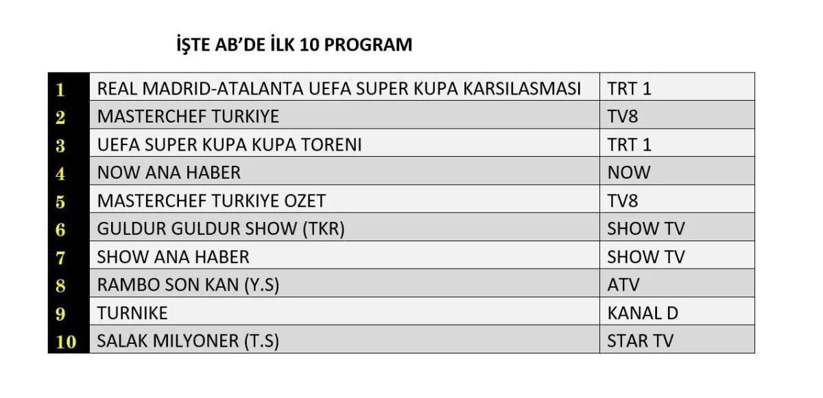 AB'de 1. sırada “Real Madrid-Atalanta UEFA Süper Kupa Karşılaşması”, 2. sırada “Masterchef Türkiye”, 3. sırada TRT1’de ekrana gelen “UEFA Süper Kupa Töreni” yer aldı.