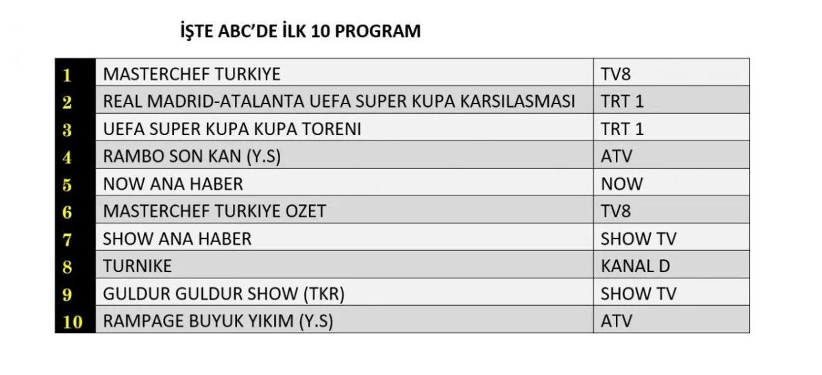 ABC'de ise 1. sırada “Masterchef Türkiye”, 2. sırada “Real Madrid-Atalanta UEFA Süper Kupa Karşılaşması”, 3. sırada “UEFA Süper Kupa Töreni” yer aldı.