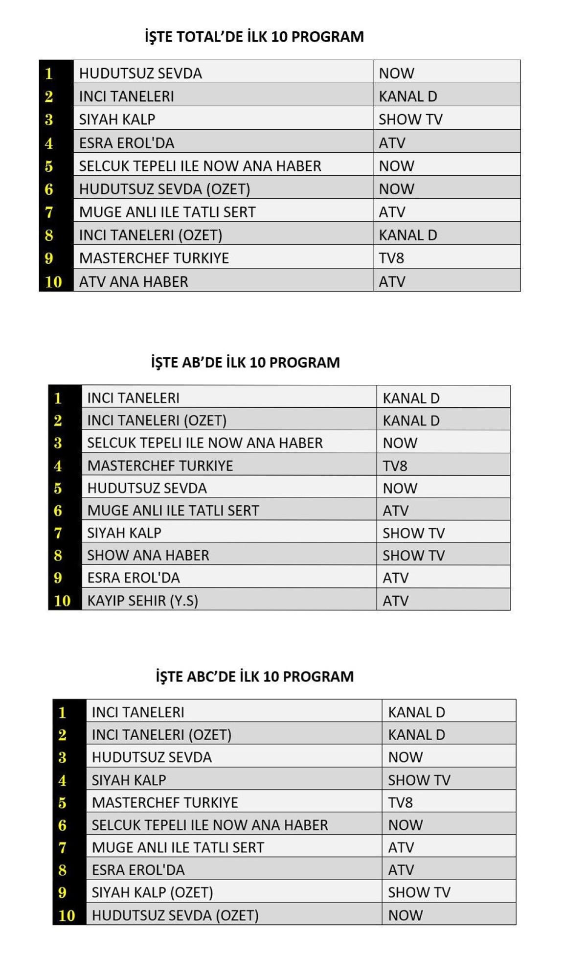 Her gün bir önceki güne ait Total, AB ve ABC sıralaması belli olurken dünün reyting sonuçları merakla bekleniyor.