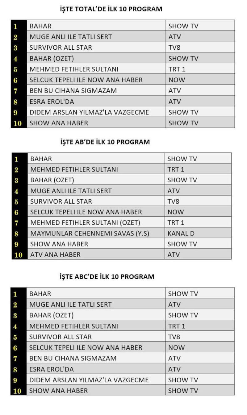 Her gün bir önceki güne ait Total, AB ve ABC sıralaması belli olurken dünün reyting sonuçları merakla bekleniyor.