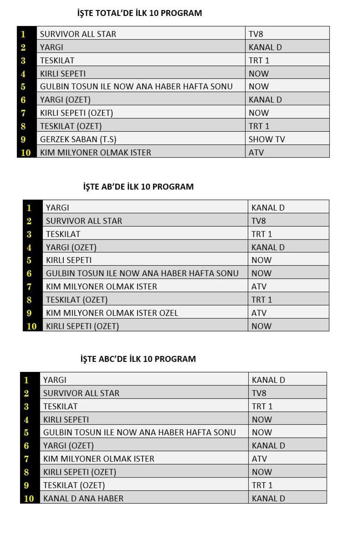 ABC'de ise 1.sırada “Yargı”, 2.sırada “Survivor All Star”, 3.sırada “Teşkilat” yer aldı.