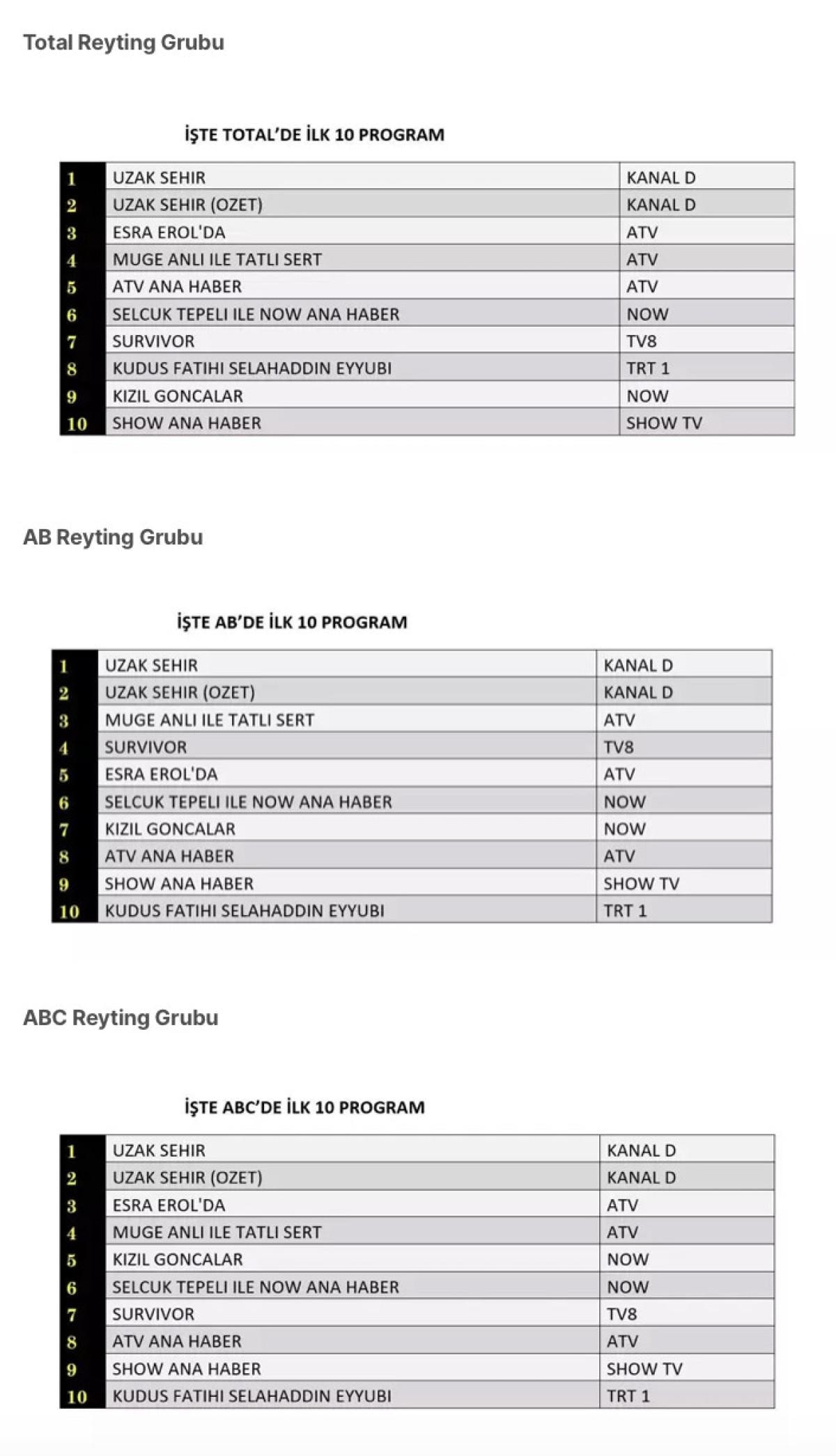 Her gün bir önceki güne ait Total, AB ve ABC sıralaması belli olurken dünün reyting sonuçları merakla bekleniyor.