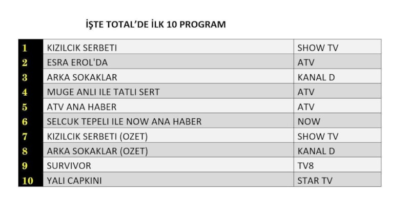 Show TV'de izleyiciyle buluşan "Kızılcık Şerbeti", Total kategorisinde zirveye yerleşti. Atv'nin "Esra Erol’da" programı ikinci sırada yer alırken, Kanal D'nin uzun soluklu dizisi "Arka Sokaklar" ise üçüncü sırada kendine yer buldu.