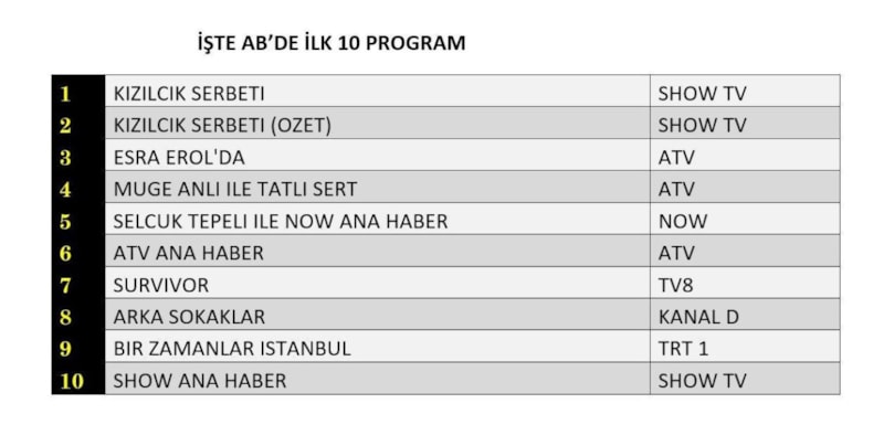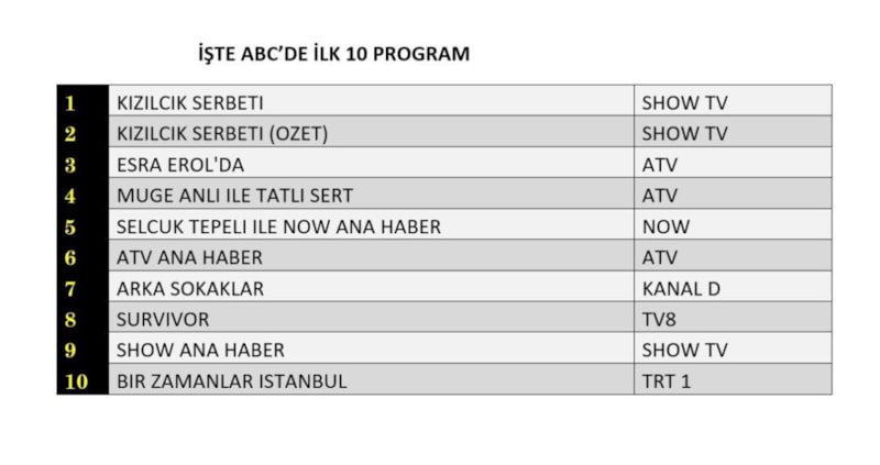 Her gün bir önceki güne ait Total, AB ve ABC sıralaması belli olurken dünün reyting sonuçları merakla bekleniyor.