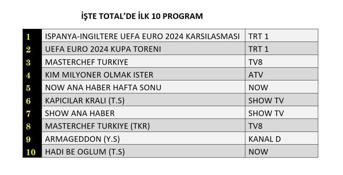 Total'de 1.sırada TRT1’de izleyiciyle buluşan “İspanya-İngiltere UEFA Euro 2024 Karşılaşması”, 2. sırada TRT1’de izleyiciyle buluşan “UEFA Euro 2024 Kupa Töreni”, 3.sırada TV8’de ekrana gelen “Masterchef Türkiye” yer aldı.