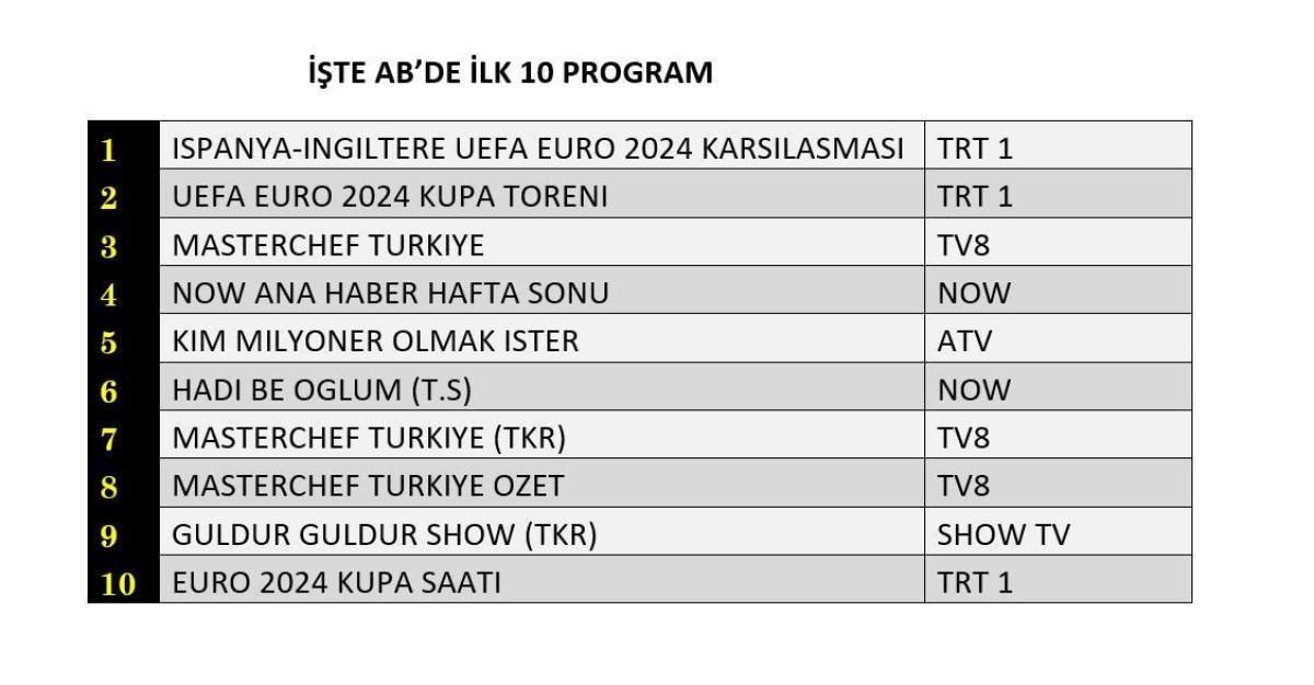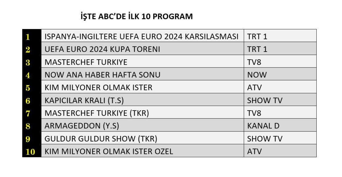 AB'de 1.sırada “İspanya-İngiltere UEFA Euro 2024 Karşılaşması”, 2.sırada “UEFA Euro 2024 Kupa Töreni”, 3.sırada “Masterchef Türkiye” yer aldı.