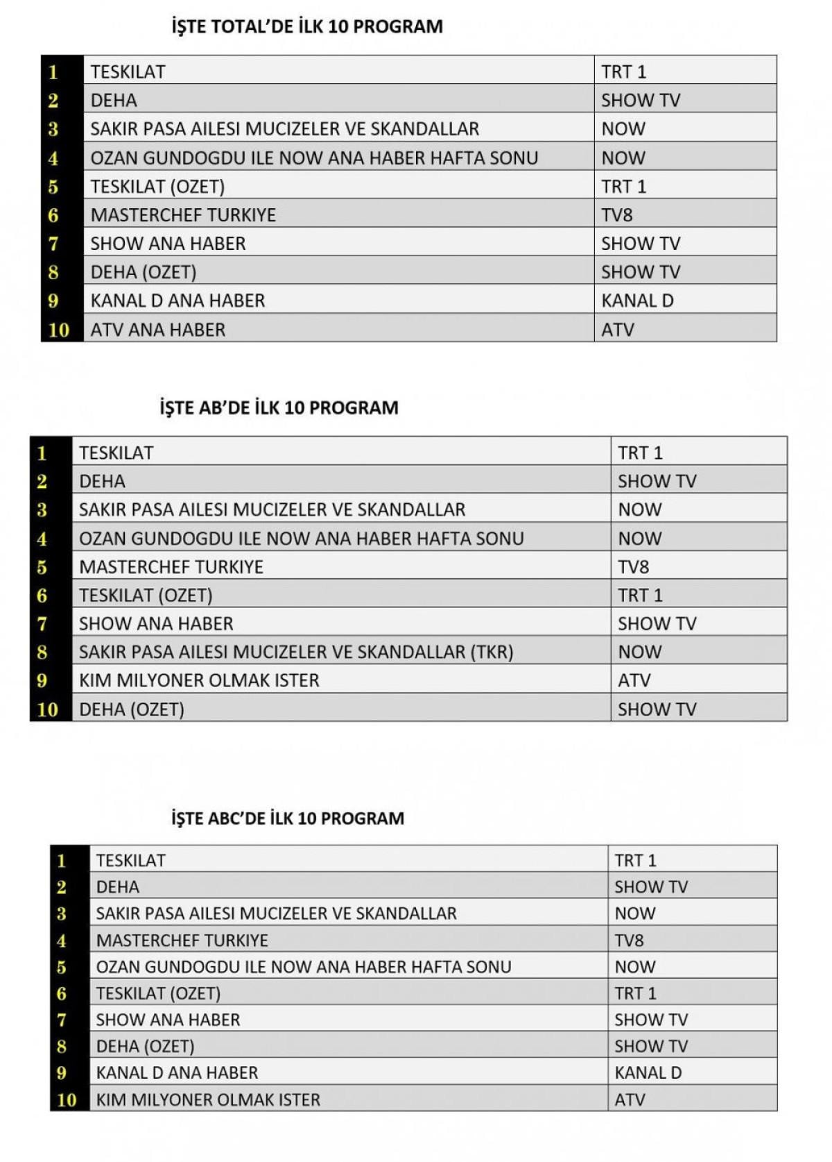 Total, AB, ABC katagorisinde 1. sırada TRT1 ekranlarında yayınlanan Teşkilat dizisi yer aldı. 2. sırada Show TV’de izleyiciyle buluşan Deha dizisi, 3 sırada Now 'da yeni başlayan Şakir Paşa Ailesi Mucizeler ve Skandallar yer aldı.