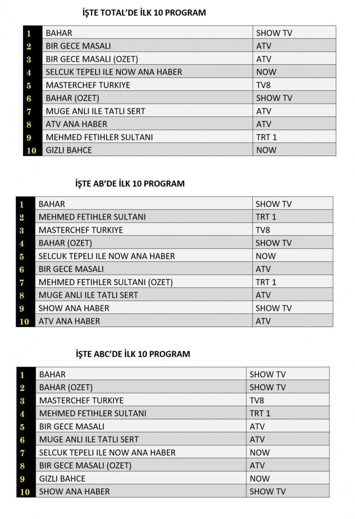 AB'de 1.sırada yine "Bahar" ilk sırada. 2.sırada TRT1'in tarih temalı dizisi "Mehmed Fetihler Sultanı" yer aldı.3.sırada ise TV8’in popüler yarışma programı "Masterchef Türkiye" yer aldı.