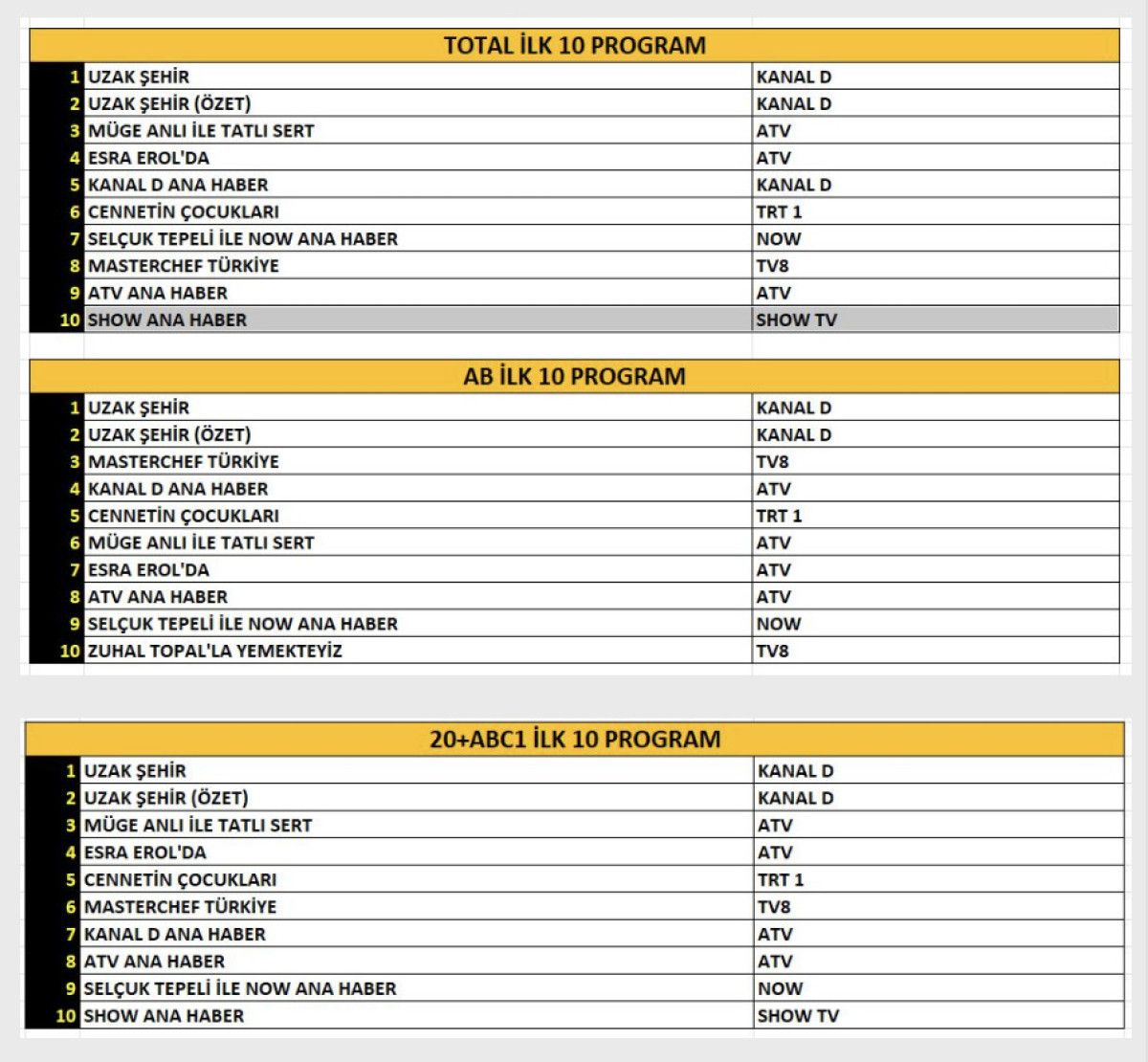 ABC’de 1. sırada “Uzak Şehir”, 2. sırada “Uzak Şehir” özet bölümü, 3. sırada ise “Müge Anlı ile Tatlı Sert” yer aldı.