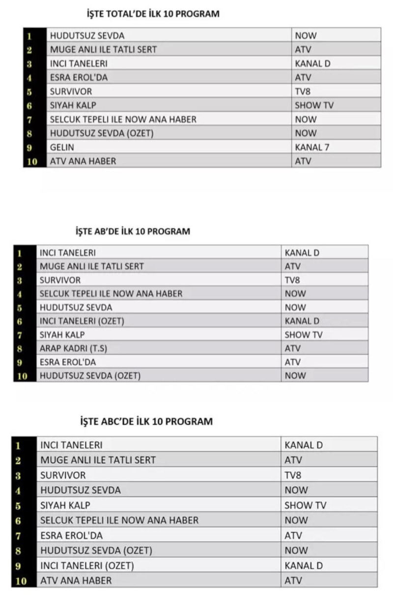 Her gün bir önceki güne ait Total, AB ve ABC sıralaması belli olurken dünün reyting sonuçları merakla bekleniyor.