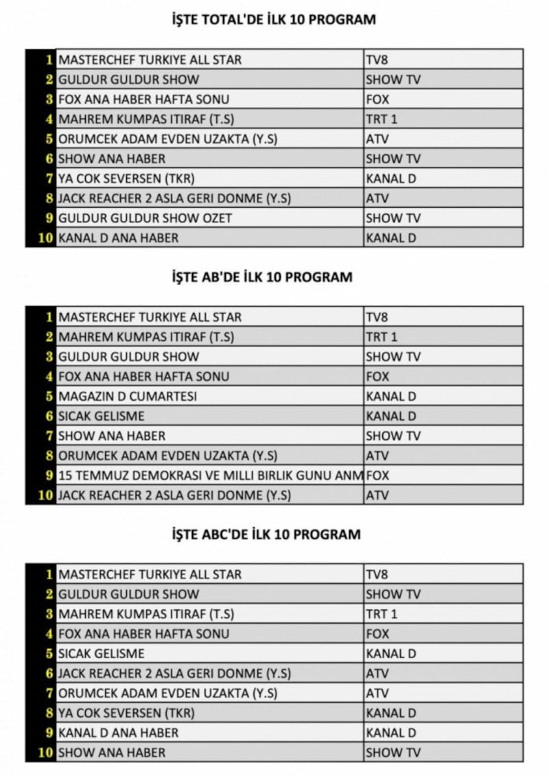 AB'de ilk sırada Masterchef Türkiye All Star, ikinci sırada Mahrem Kumpas itiraf, üçüncü sırada Güldür Güldür yer aldı.