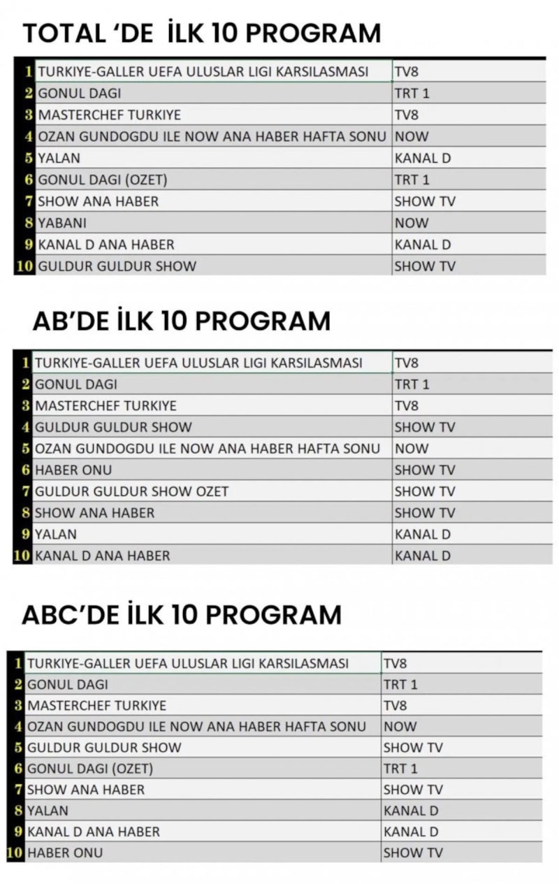 ABC’de 1. sırada “Türkiye - Galler UEFA Uluslar Ligi Karşılaşması” yer aldı.2. sırada “Gönül Dağı” yer aldı. 3. sırada ise “MasterChef Türkiye” yer aldı.