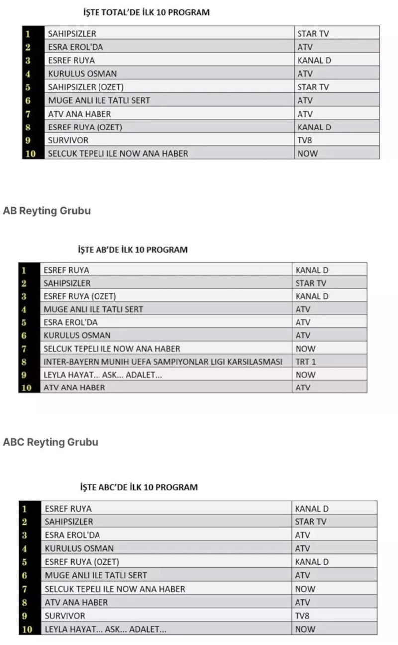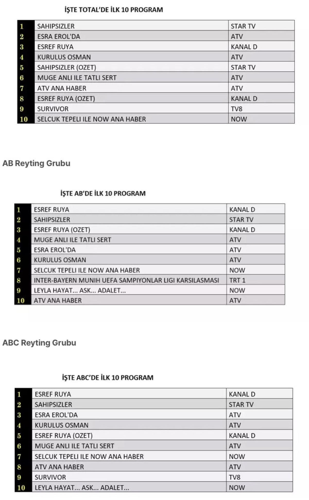 Total grubunda Sahipsizler dizisi zirvede yer alırken, Eşref Rüya ikinci sıraya yerleşti. AB ve ABC gruplarında ise Eşref Rüya dizisi zirveyi kaptı.