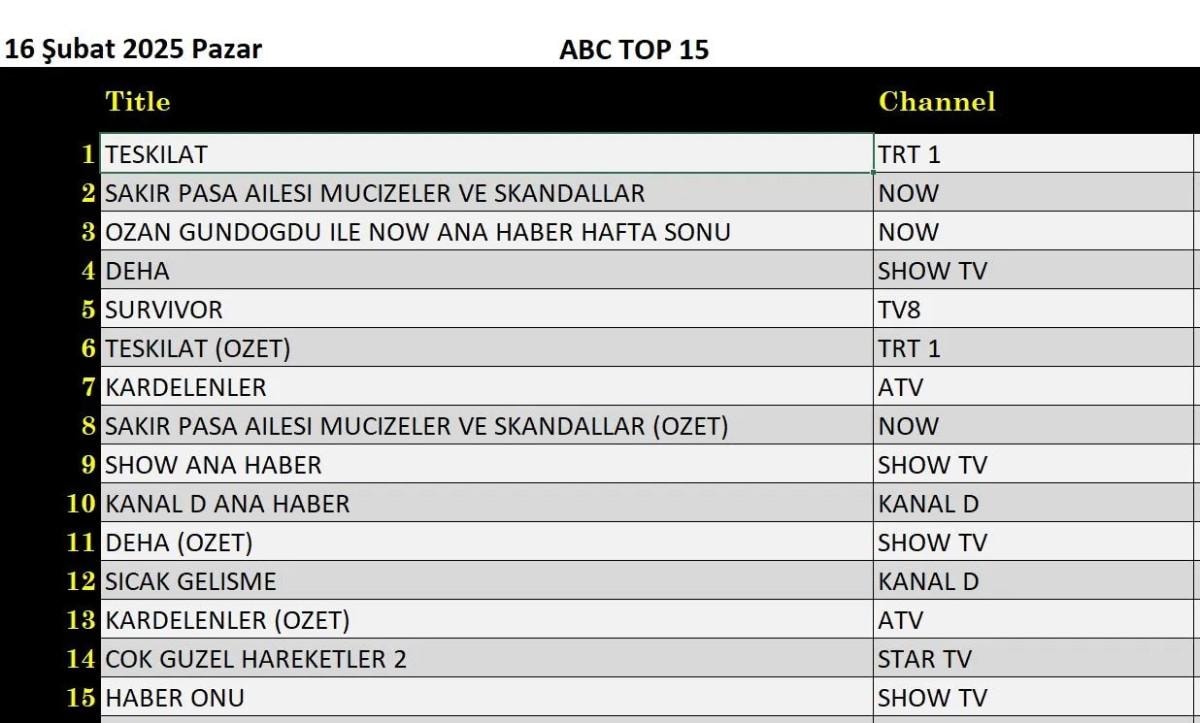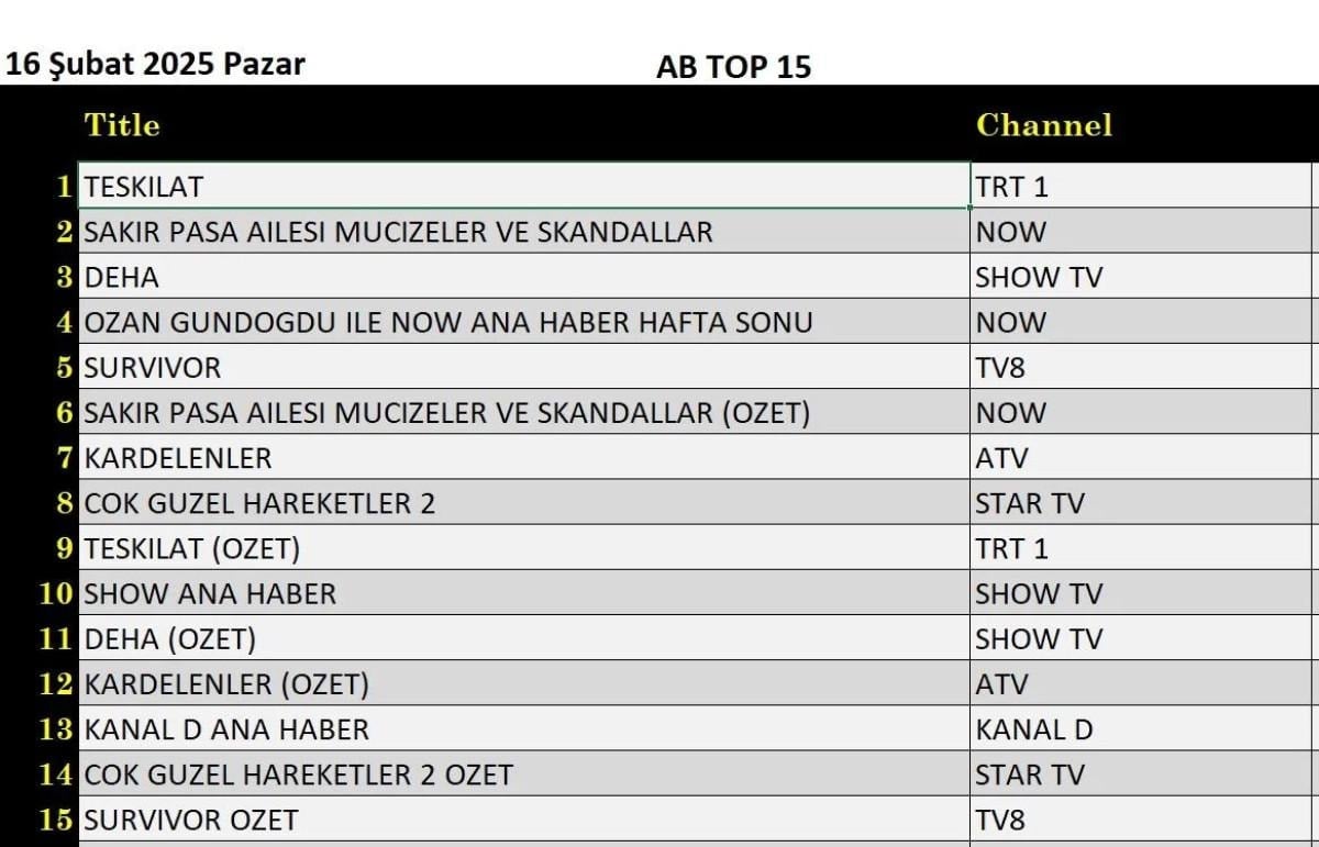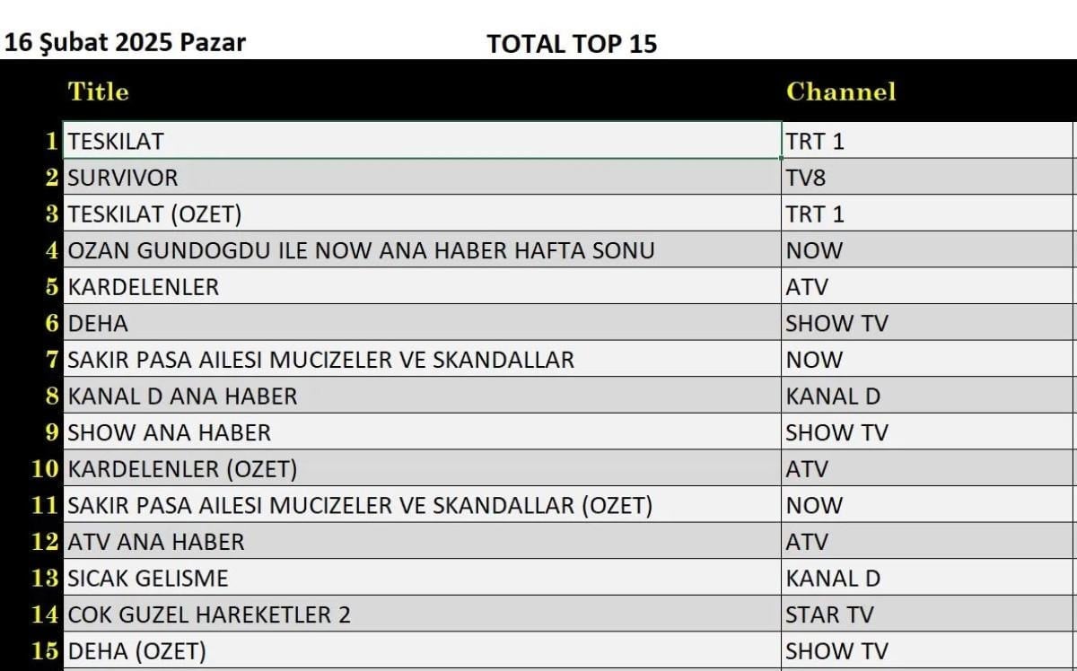 16 ŞUBAT PAZAR REYTİNG SONUÇLARI