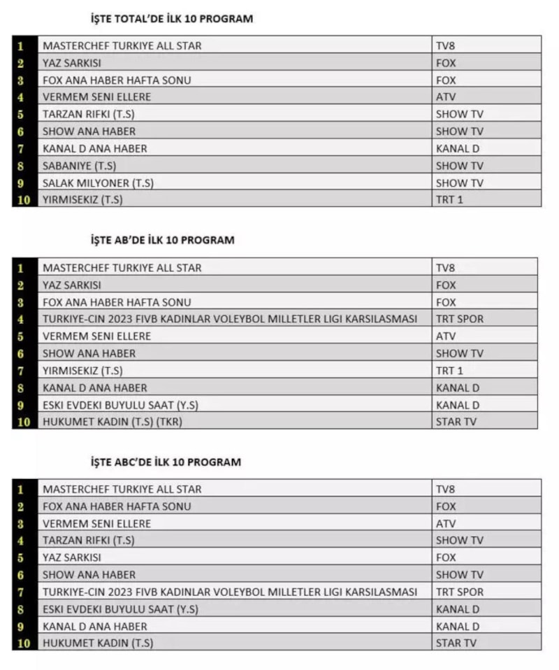 Her gün bir önceki güne ait Total, AB ve ABC sıralaması belli olurken dünün reyting sonuçları merakla bekleniyor.