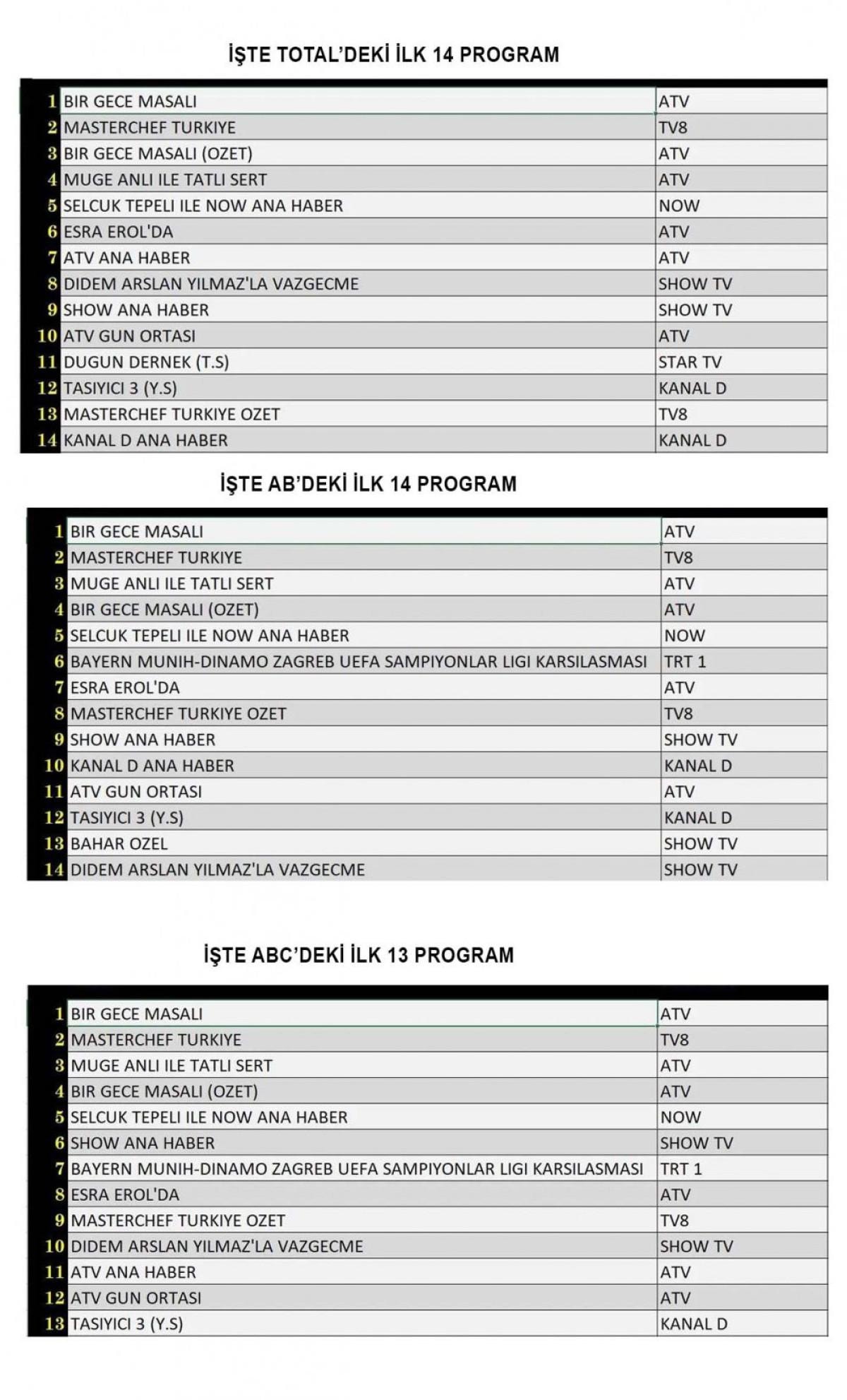 ABC'de ise 1.sırada “Bir Gece Masalı”, 2.sırada “Masterchef Türkiye”, 3.sırada “Müge Anlı Tatlı Sert” yer aldı.