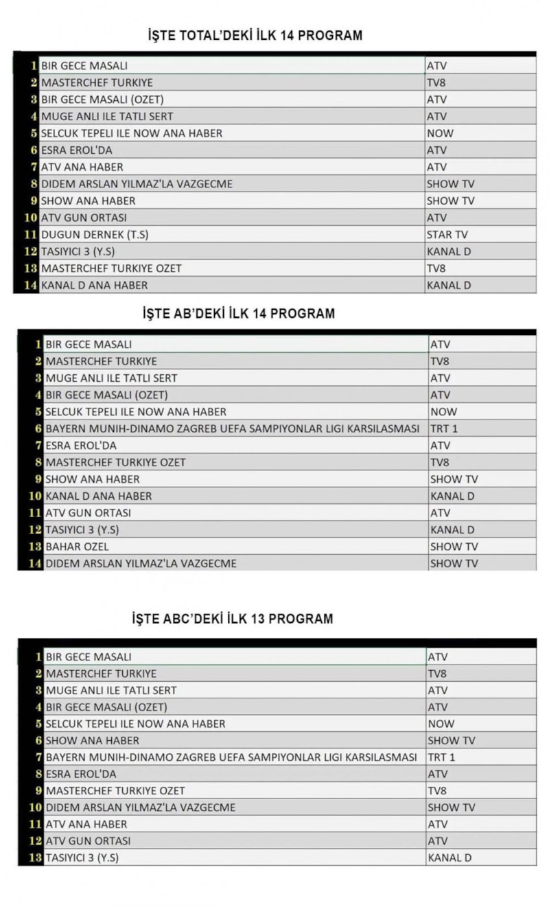 Her gün bir önceki güne ait Total, AB ve ABC sıralaması belli olurken dünün reyting sonuçları merakla bekleniyor.