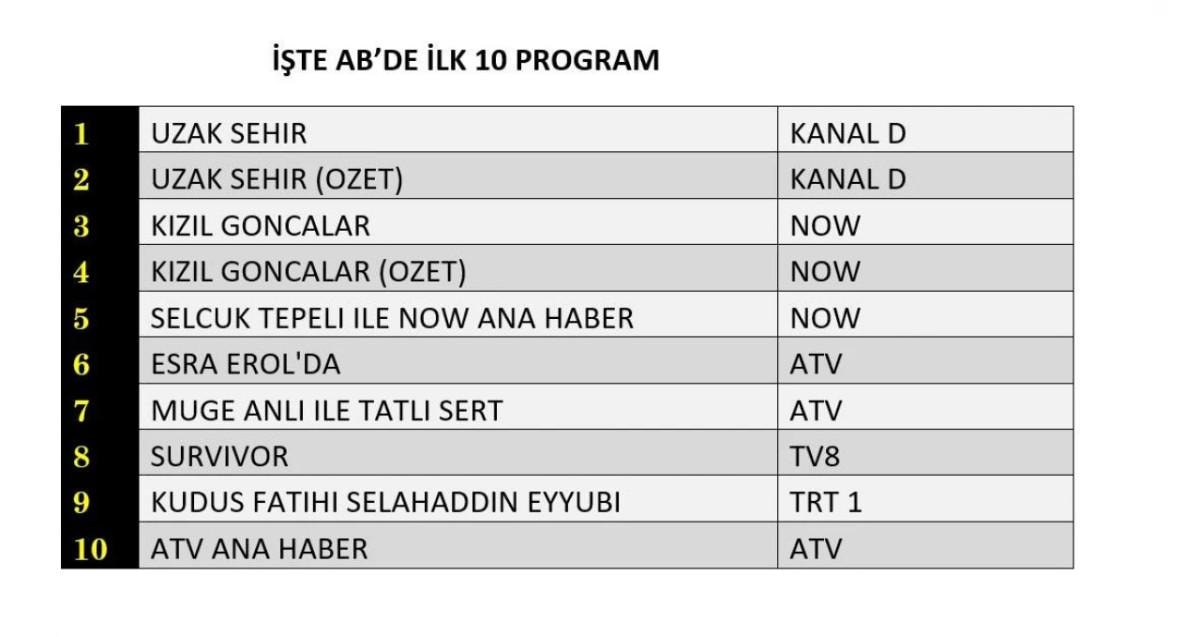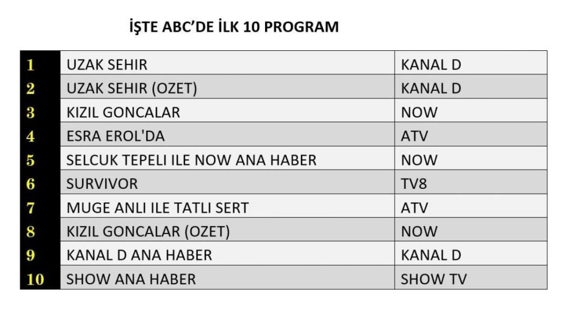 Her gün bir önceki güne ait Total, AB ve ABC sıralaması belli olurken dünün reyting sonuçları merakla bekleniyor.