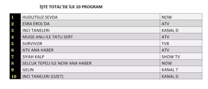 Total grubunda NOW TV'nin dizisi Hudutsuz Sevda dizisi zirveyi kaptı. İkinci sırada ise Esra Erol'da programı yer aldı.